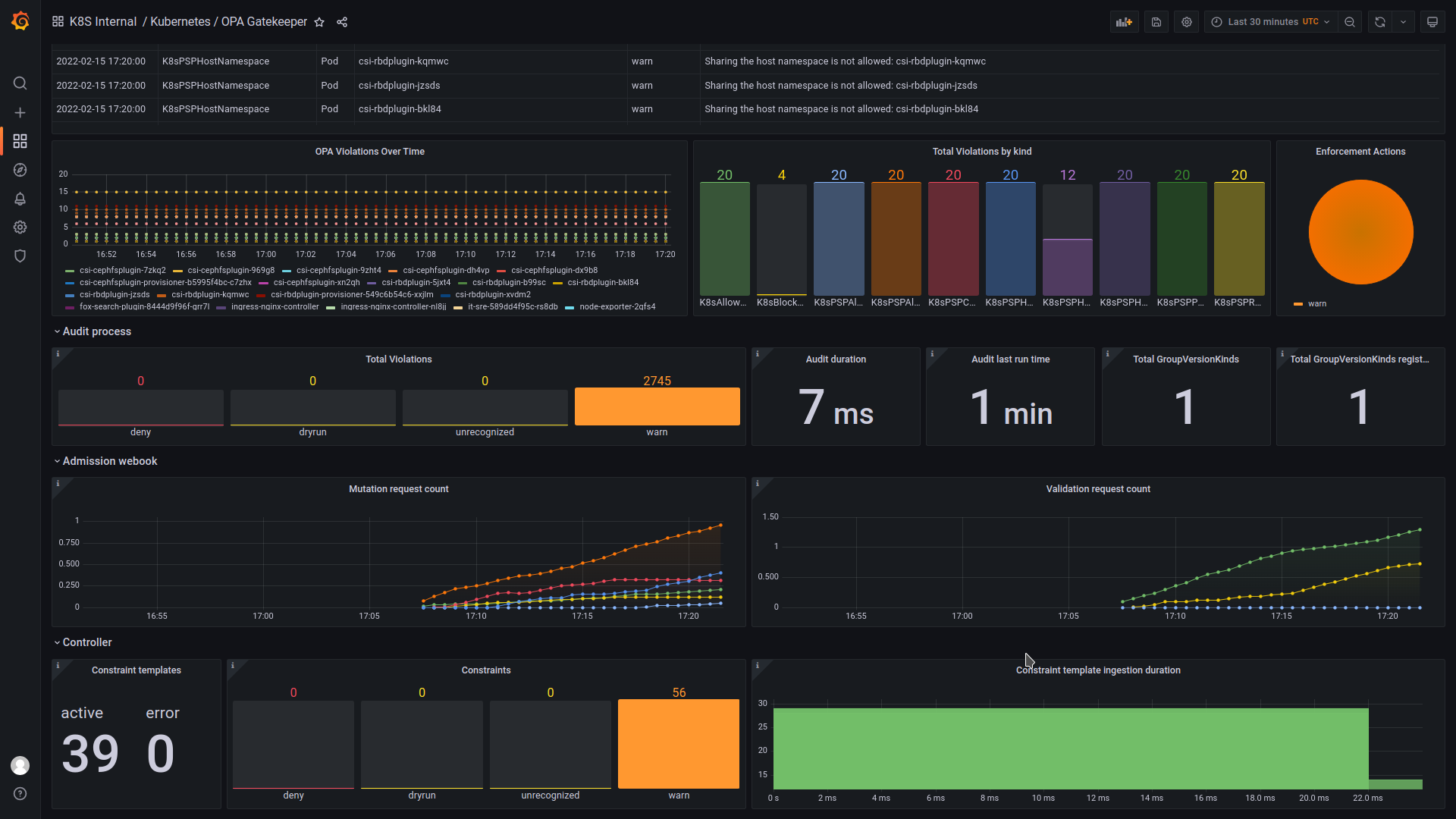 This is a dashboard show metrics received from open policy agent Gatekeeper and scorecard: