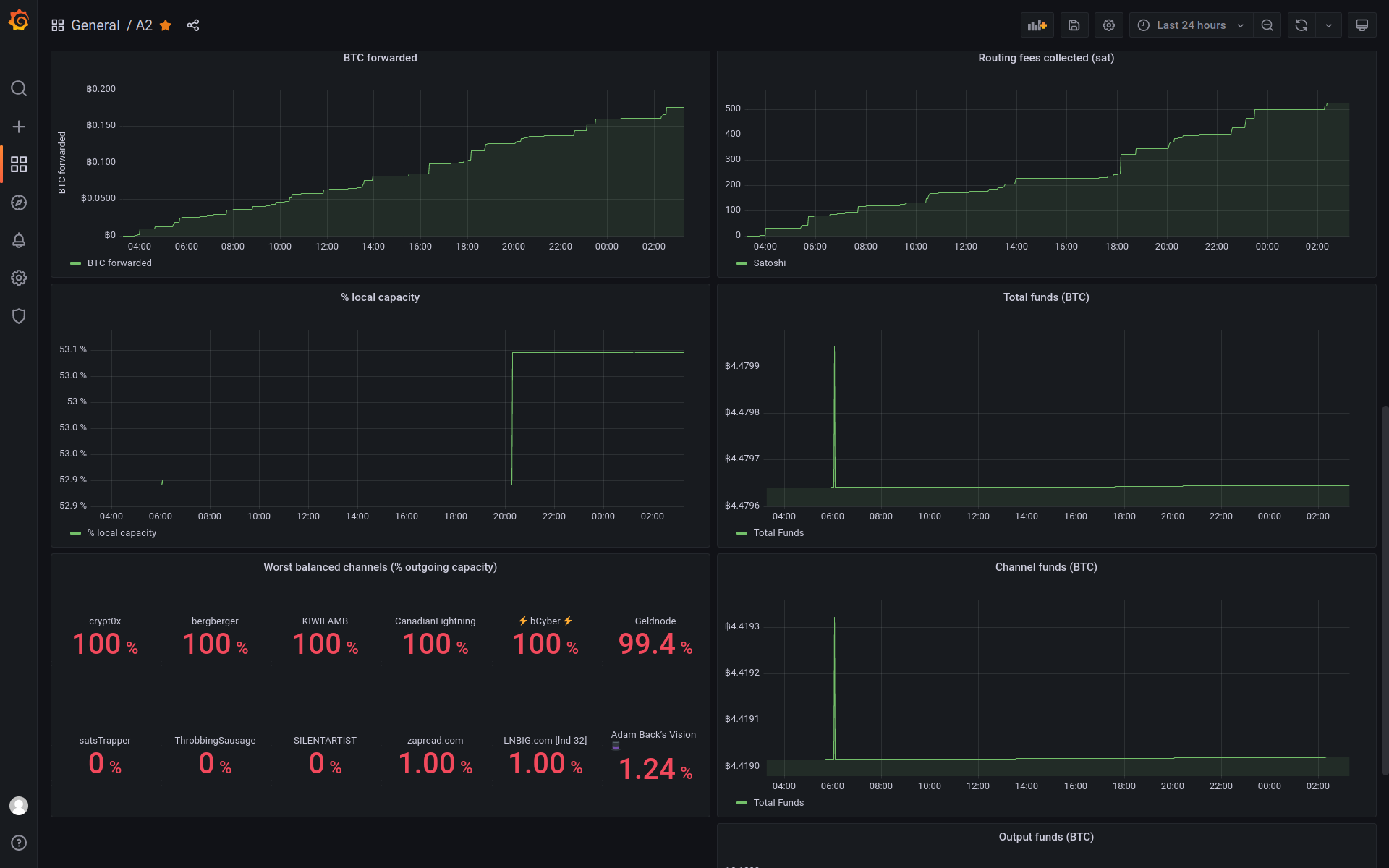 Suitable for nodes with many channels, focusing on the top/bottom nodes/channels. Showing many metrics in BTC (not satoshis) for readability at higher throughput.