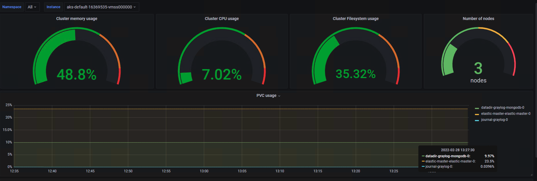 The Kubernetes monitoring by namespace and instance dashboard uses the prometheus data source to create a Grafana dashboard with the gauge, stat and timeseries panels.