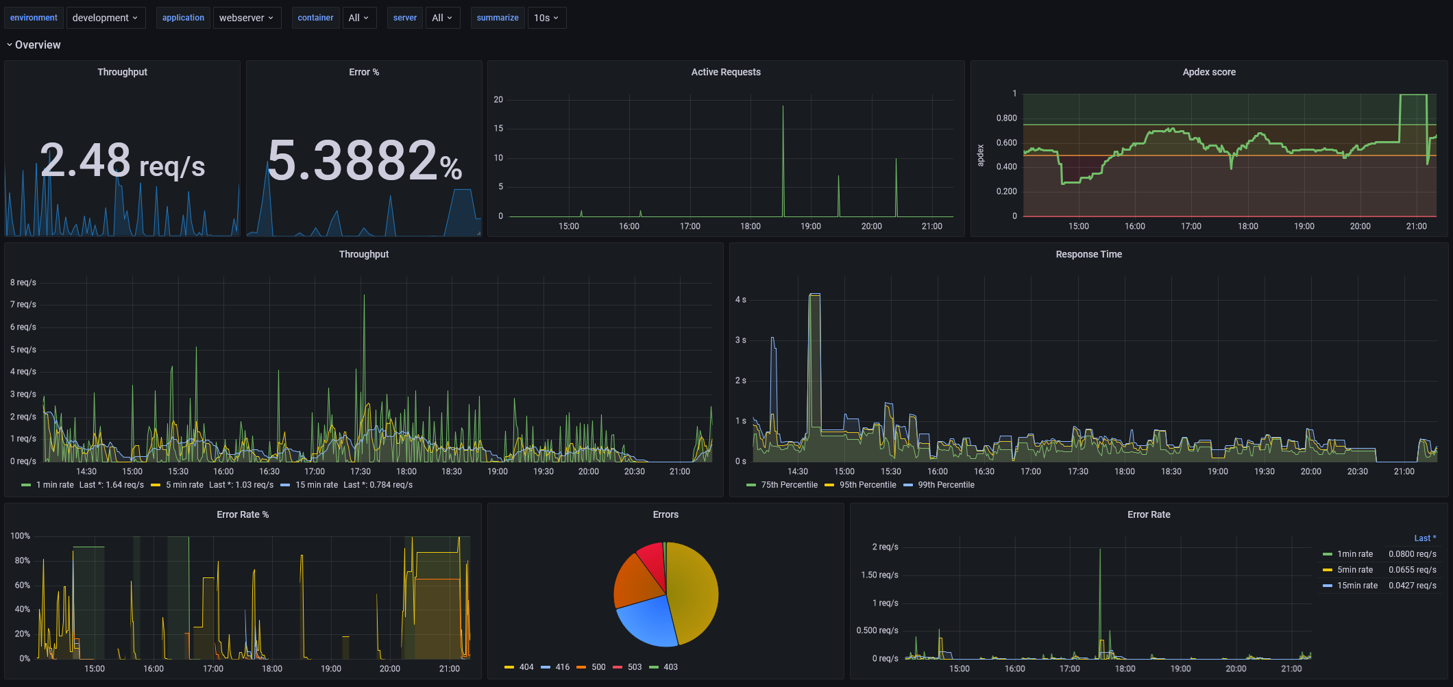 This dashboard is a fixed and updated version of the 2204 dashboard. It is for use with the default metrics captured by App Metric's ASP.NET Core Middleware and the App Metrics Prometheus reporter.
