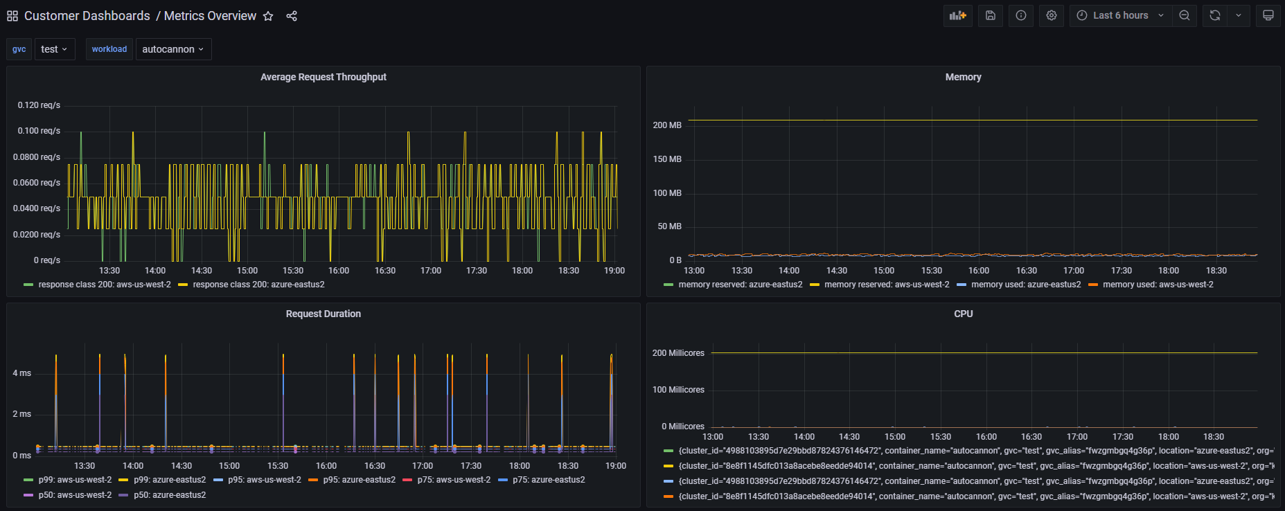 This dashboard shows a summary of a specific workload's performance and resource consumption over time. You may choose a different GVC and workload using the drop-downs at the top of the screen.