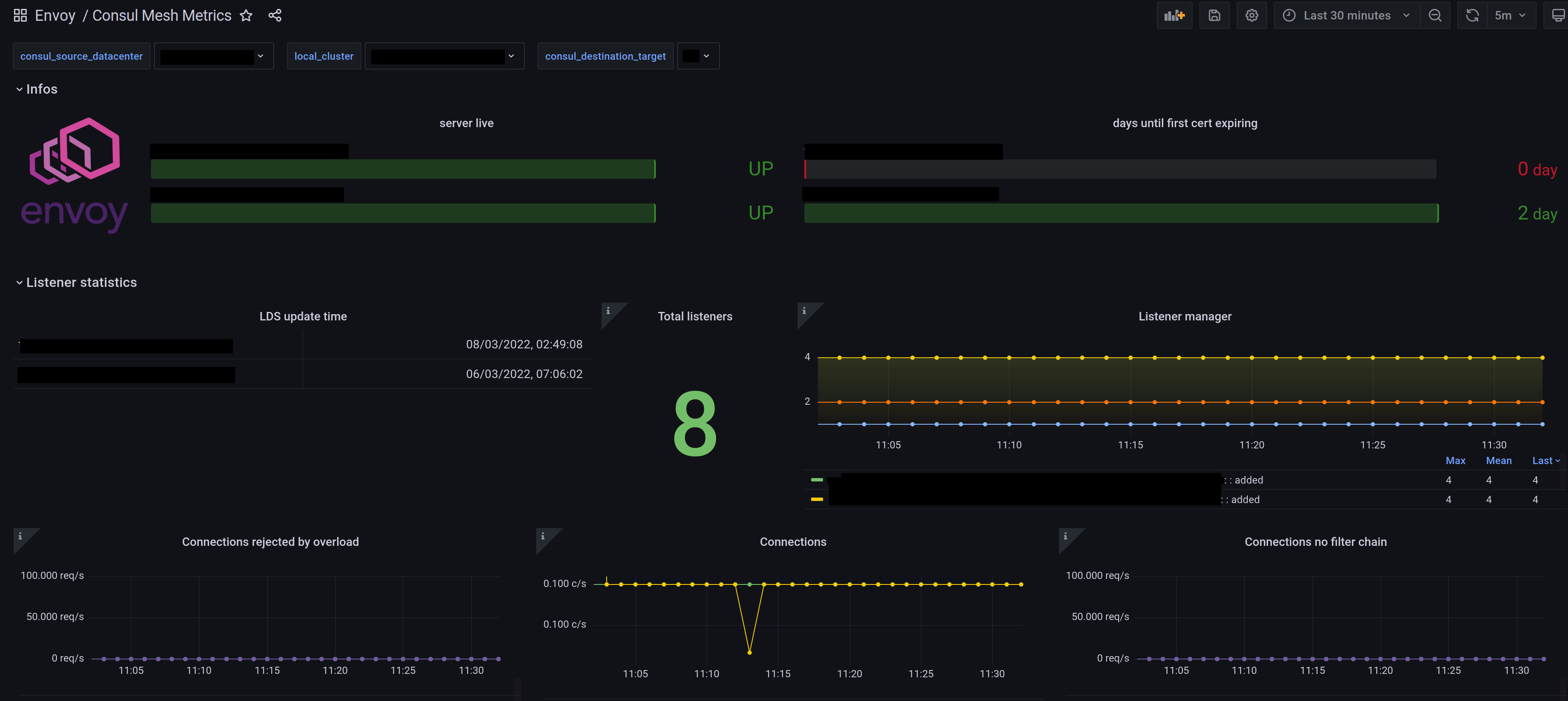 filterable by source_consul_datacenter / envoy_cluster / consul_destination_target.
