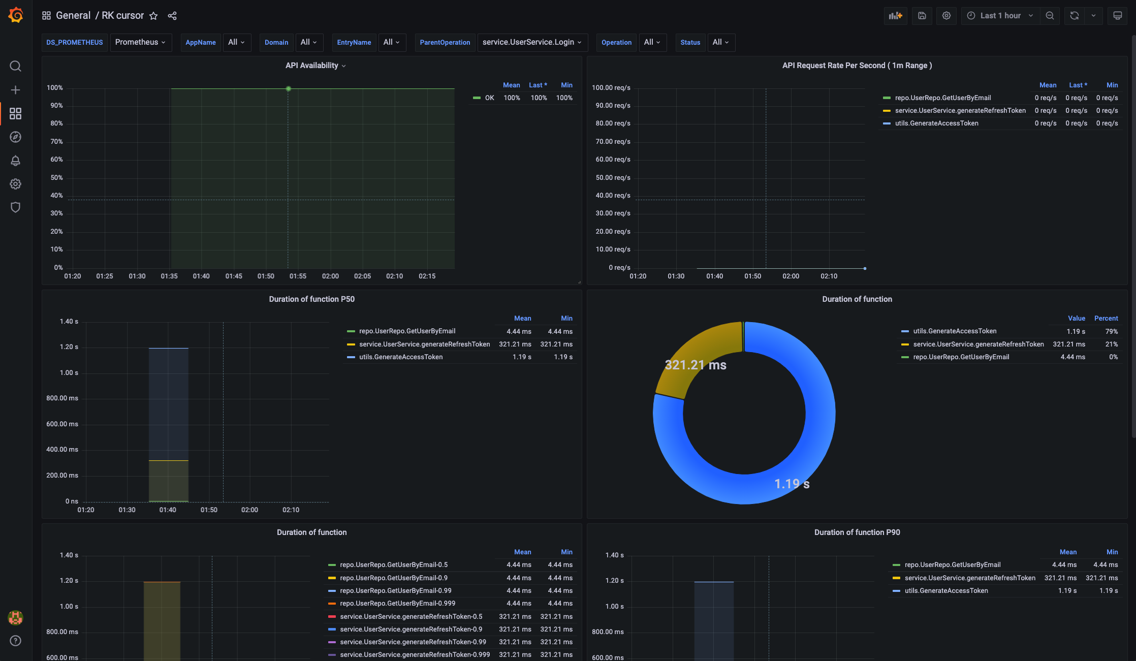 The RK cursor dashboard uses the prometheus data source to create a Grafana dashboard with the piechart and timeseries panels.
