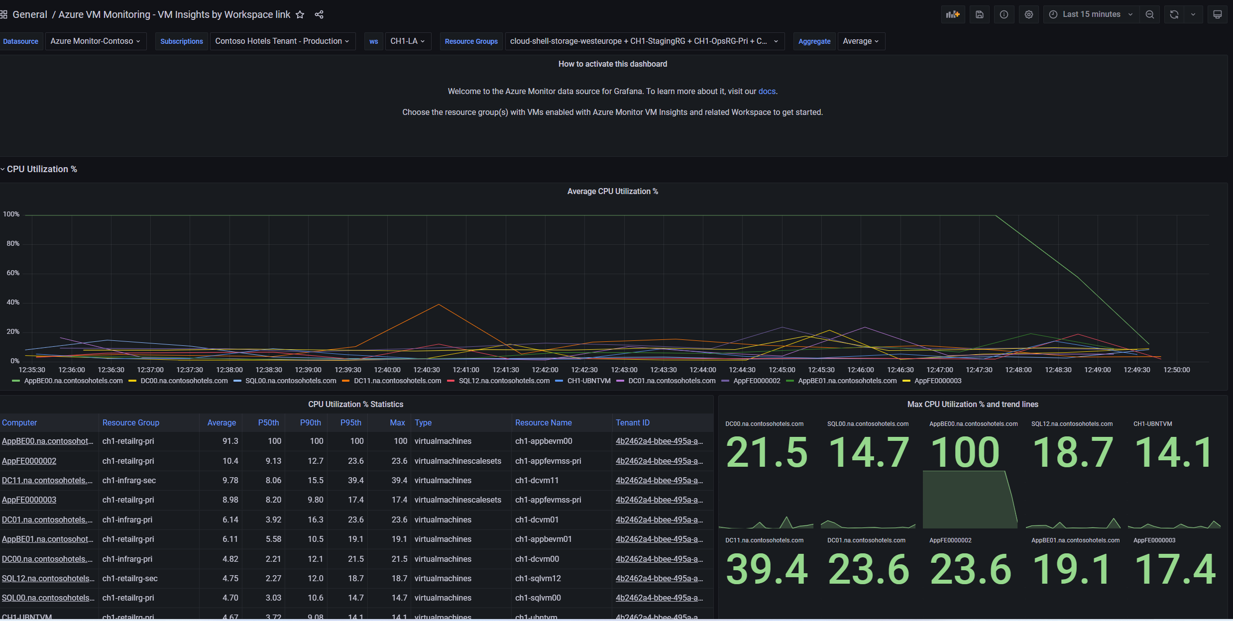 Using Azure Monitor data source, this dashboard provides insights for VM monitoring through a number of VM Insights metrics. You will be able to access key details on metrics like CPU Utilization %, Available Memory, Network Bytes Sent, Network Bytes Received and Logical Disk Space Used %. Use this dashboard if you would like to filter data by workspace.