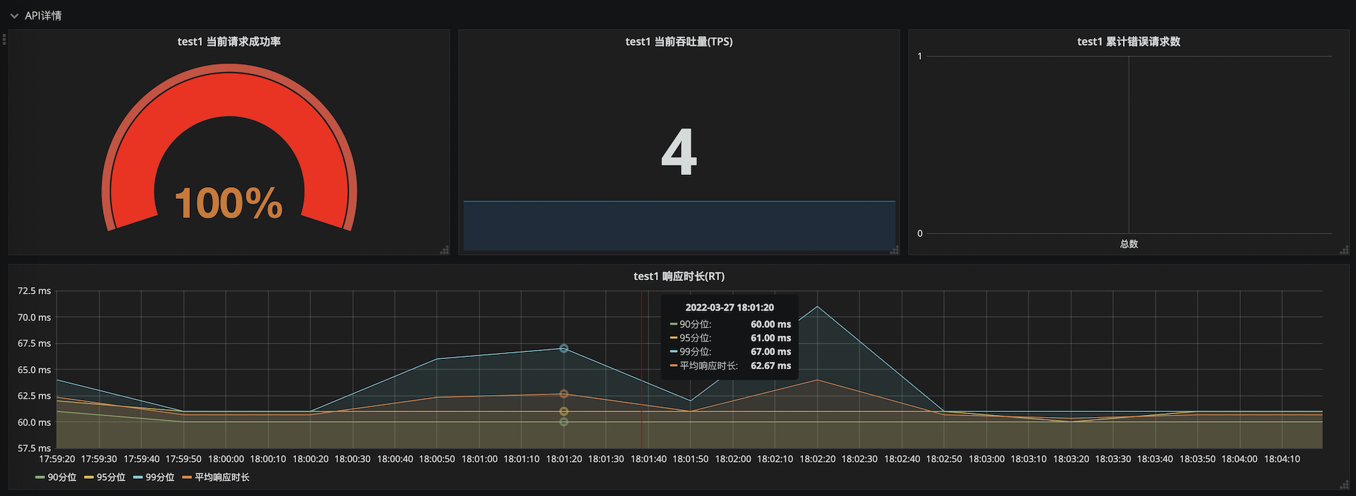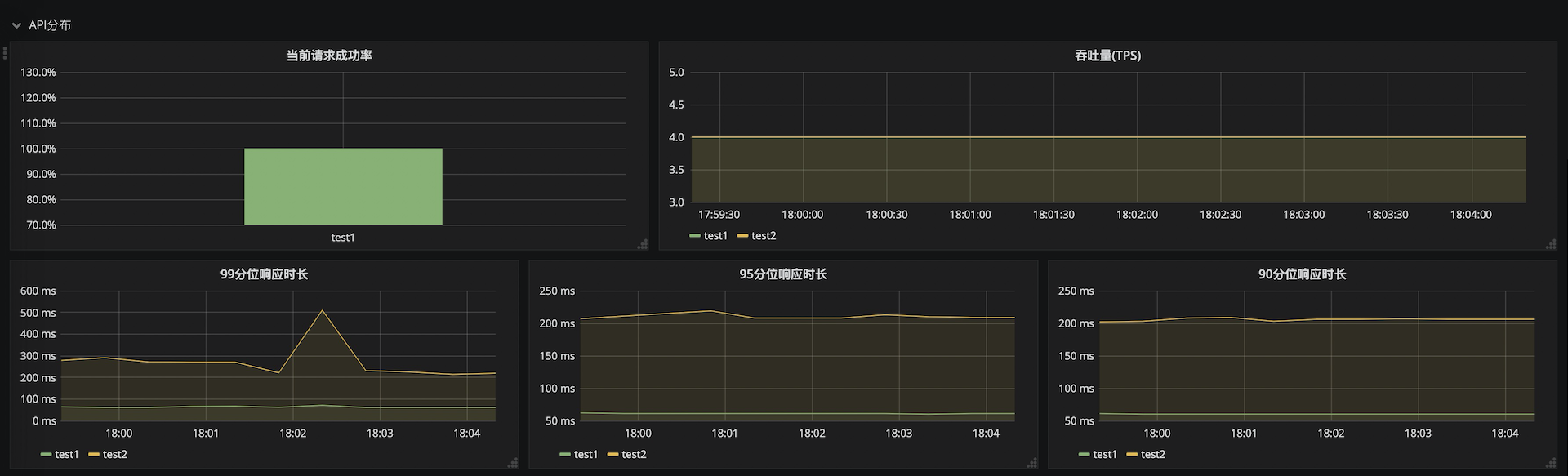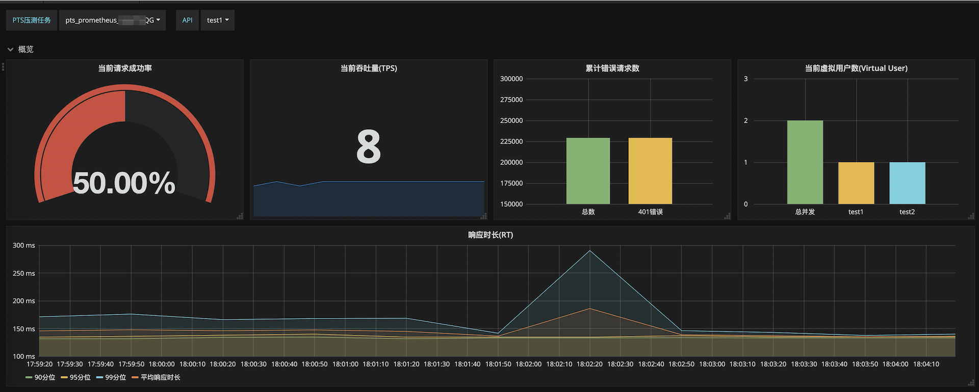 基于Prometheus和Grafana的阿里云PTS(Performance Testing Service)压测监控。 在概览中,本Dashboard提供了全局请求成功率,系统吞吐量(TPS),99、95、90分位响应时长,以及按错误状态码聚合的错误请求数等数据。 在API分布中,可以直观的对比各API的监控指标,快速定位性能短板API。 在API详情中,可以查看单个API的详细指标,准确定位性能瓶颈。 另外,dashboard提供了施压机的JVM垃圾回收监控指标,可以辅助判断施压机是否是压测链路中的性能瓶颈。