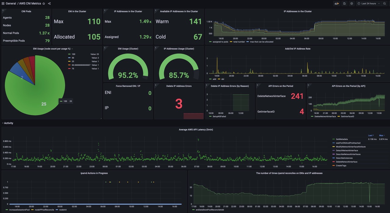 USE (Utilization Saturation Errors) metrics dashboards for troubleshooting pod IP management in EKS
