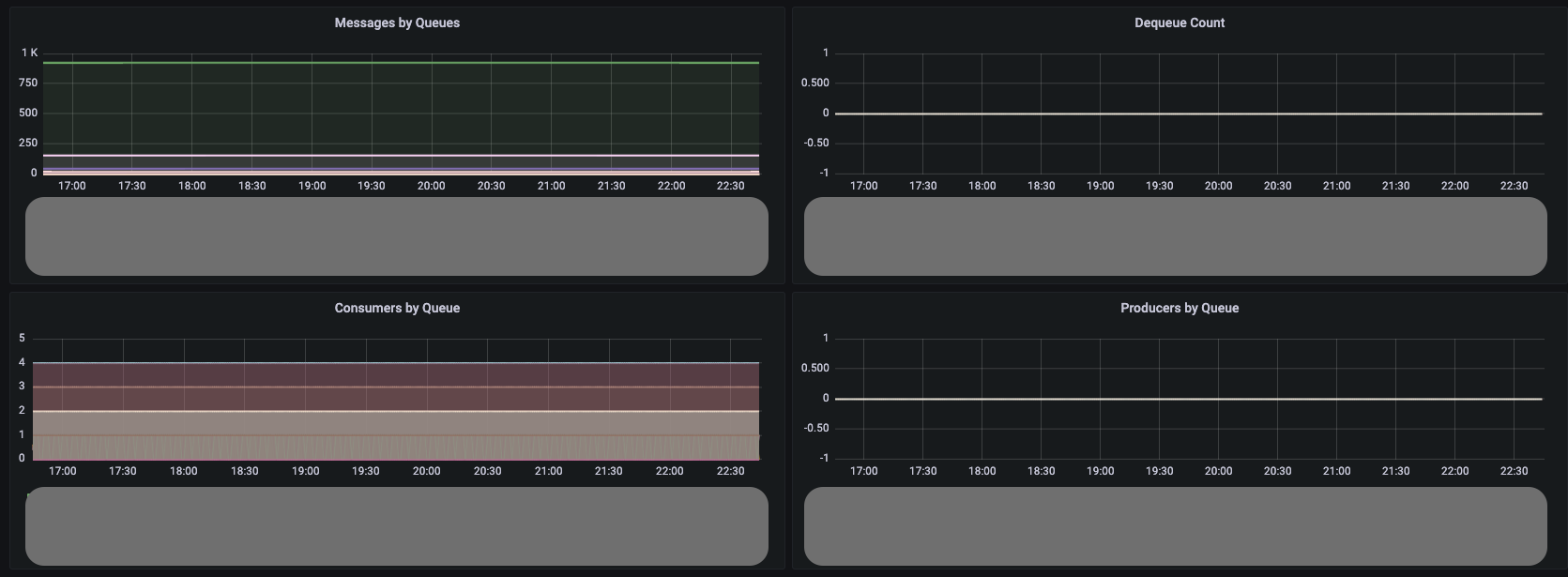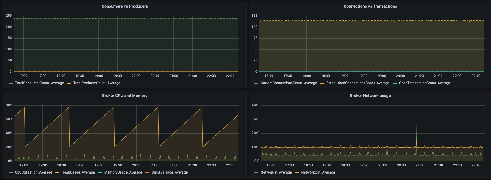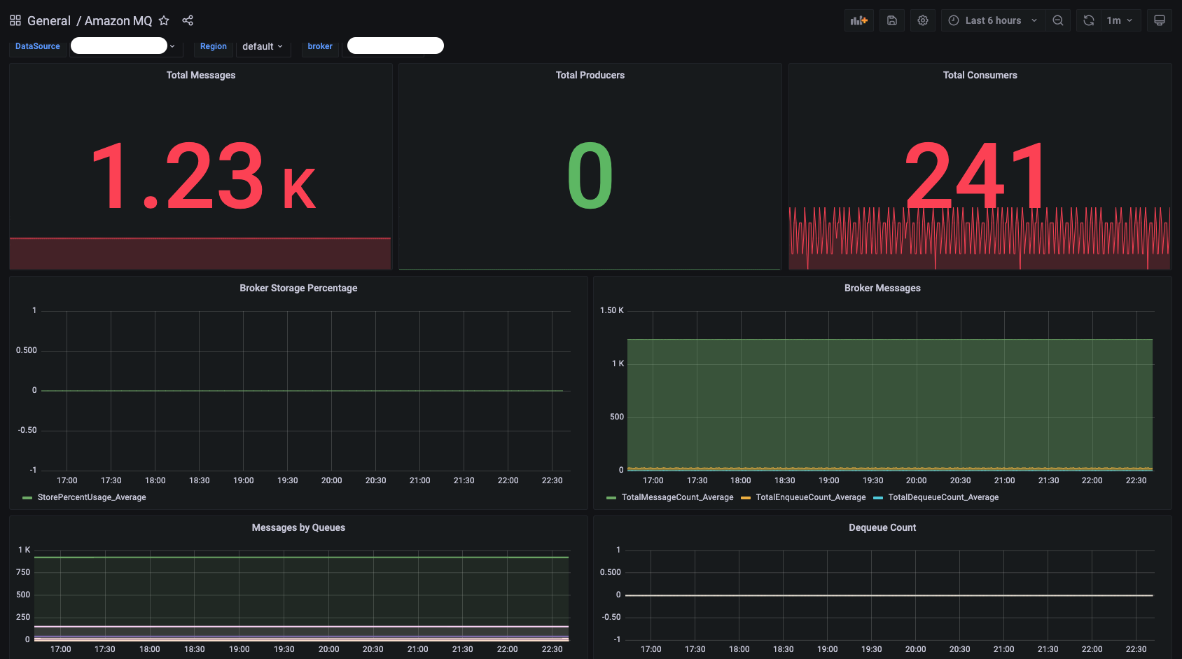 This dashboard shows the key broker metrics from CloudWatch for Active MQ.