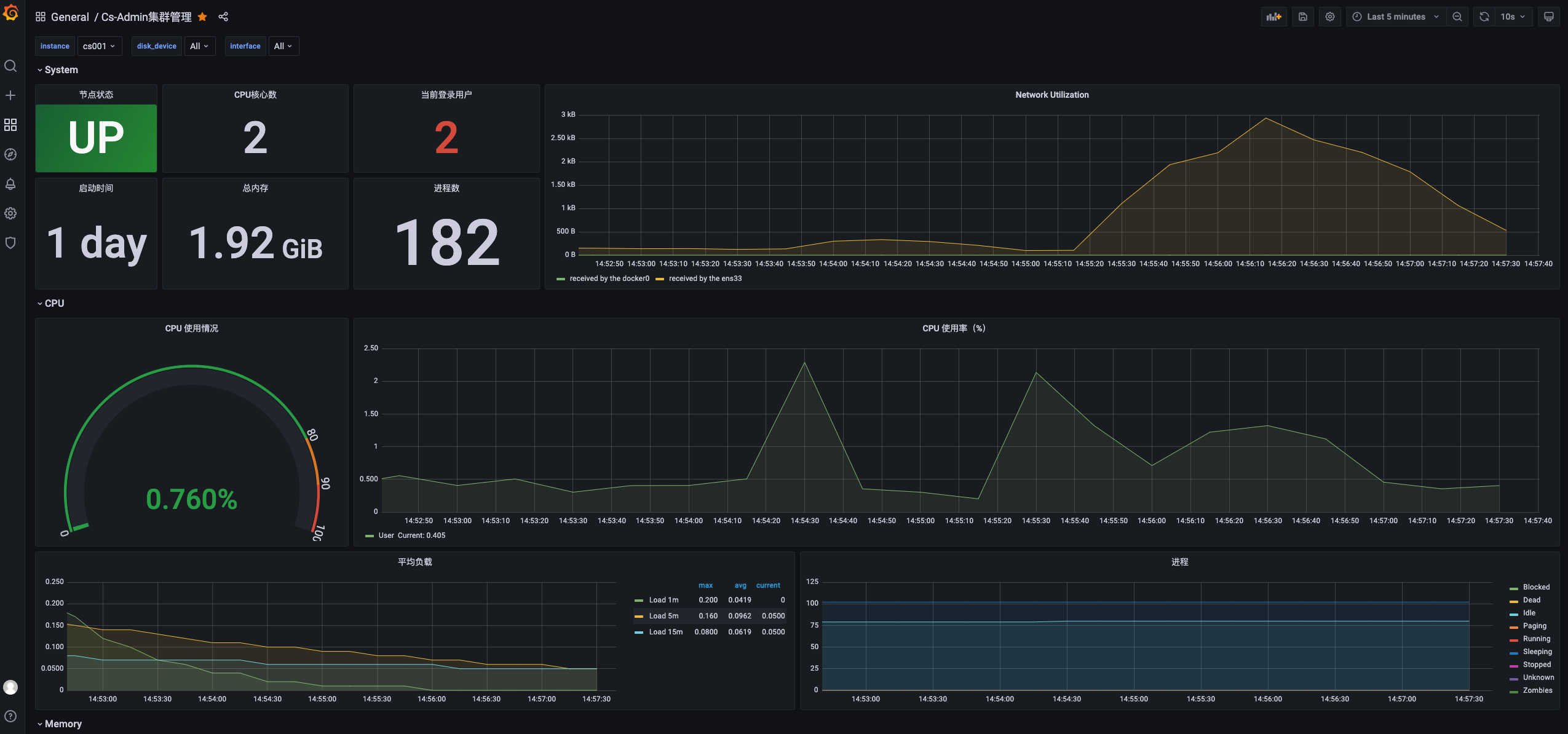 The Cs-Admin集群管理 dashboard uses the prometheus data source to create a Grafana dashboard with the gauge, graph, stat and timeseries panels.