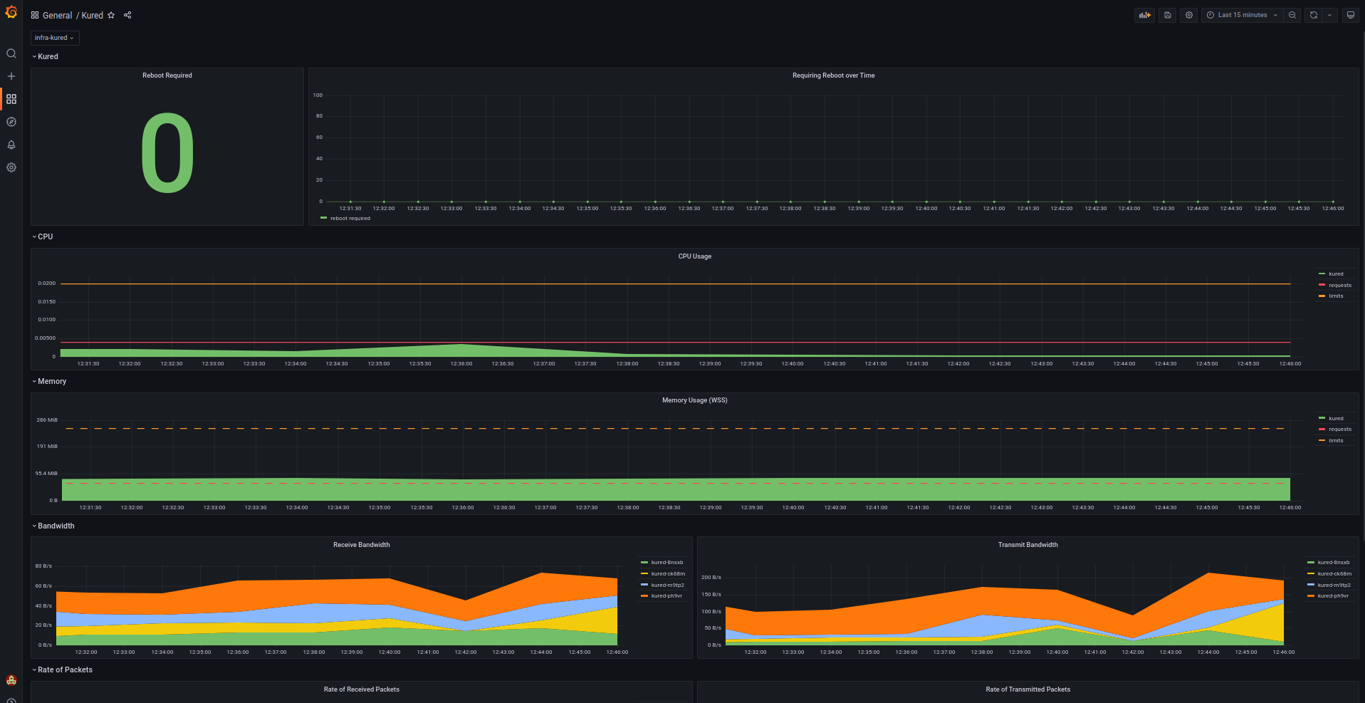 Displays the amount of nodes needing a reboot as reported by the kubernetes reboot daemon (kured) as well as CPU and Memory Usage for the Kured pods.