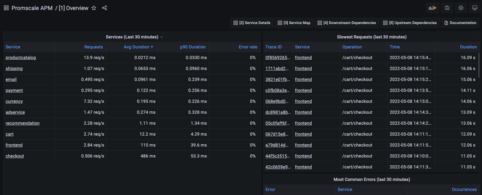 APM Overview dashboard offered by Promscale on top of traces by leveraging SQL and TimescaleDB capabilities.