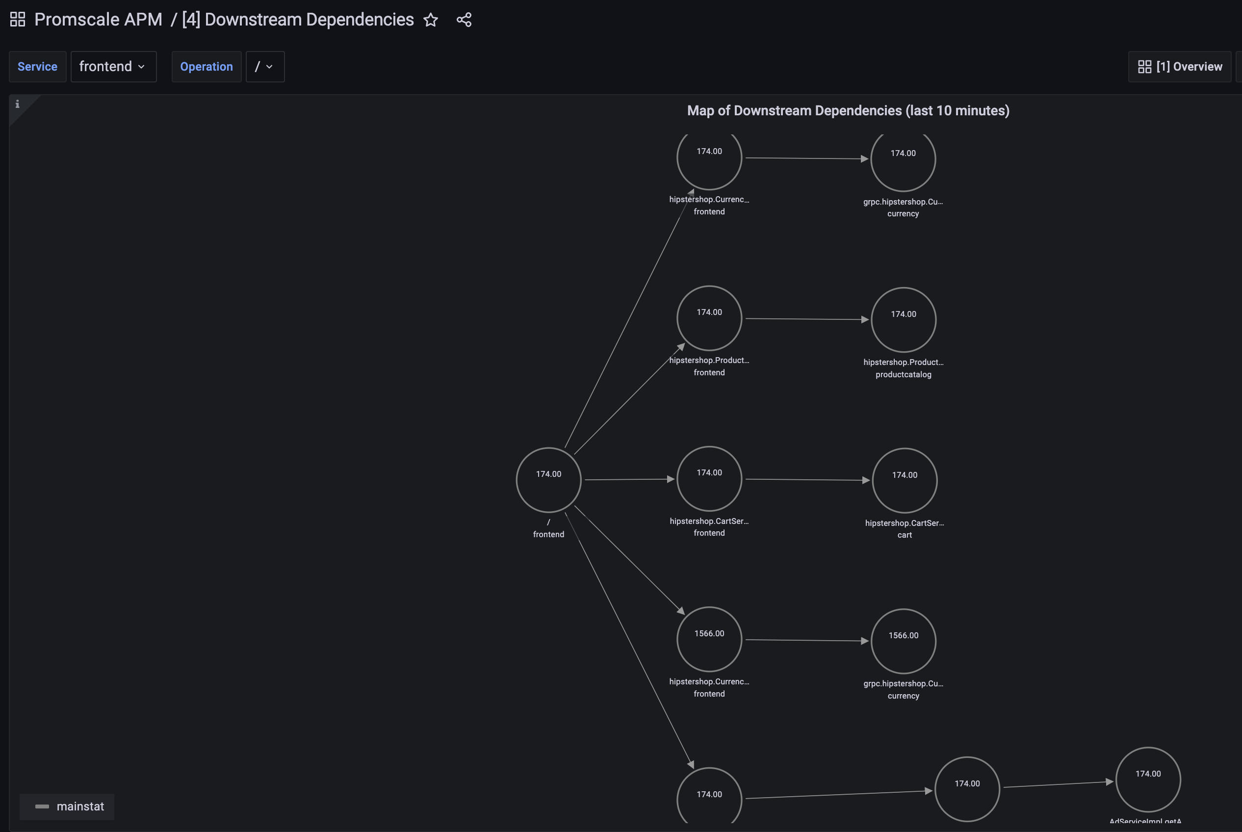 - Map of Downstream Dependencies representing nodes and edges here nodes are services and edges are connections between services. This panel represents all downstream dependencies for the selected service and operation.