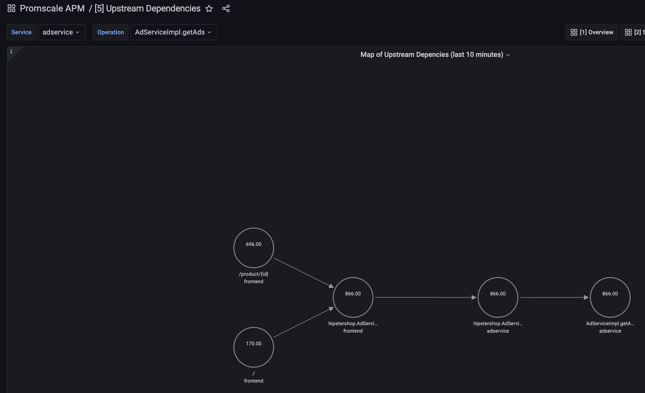 - Map of Upstream Dependencies representing nodes and edges here nodes are services and edges are connections between services. This panel represents all upstream dependencies for the selected service and operation.