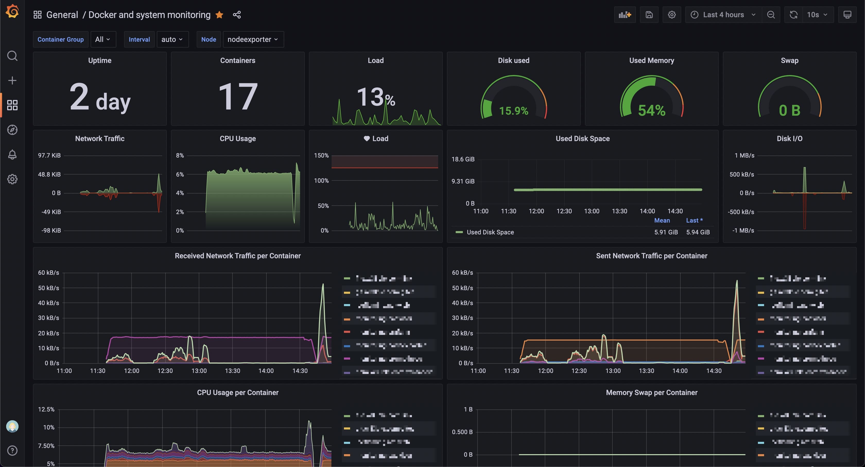 This dashboard display Docker and system metric, the aim it's to have all the metric on one dashboard. The first lines represents the system metric with gauge and text/graph (easy to visualize and minimalist).