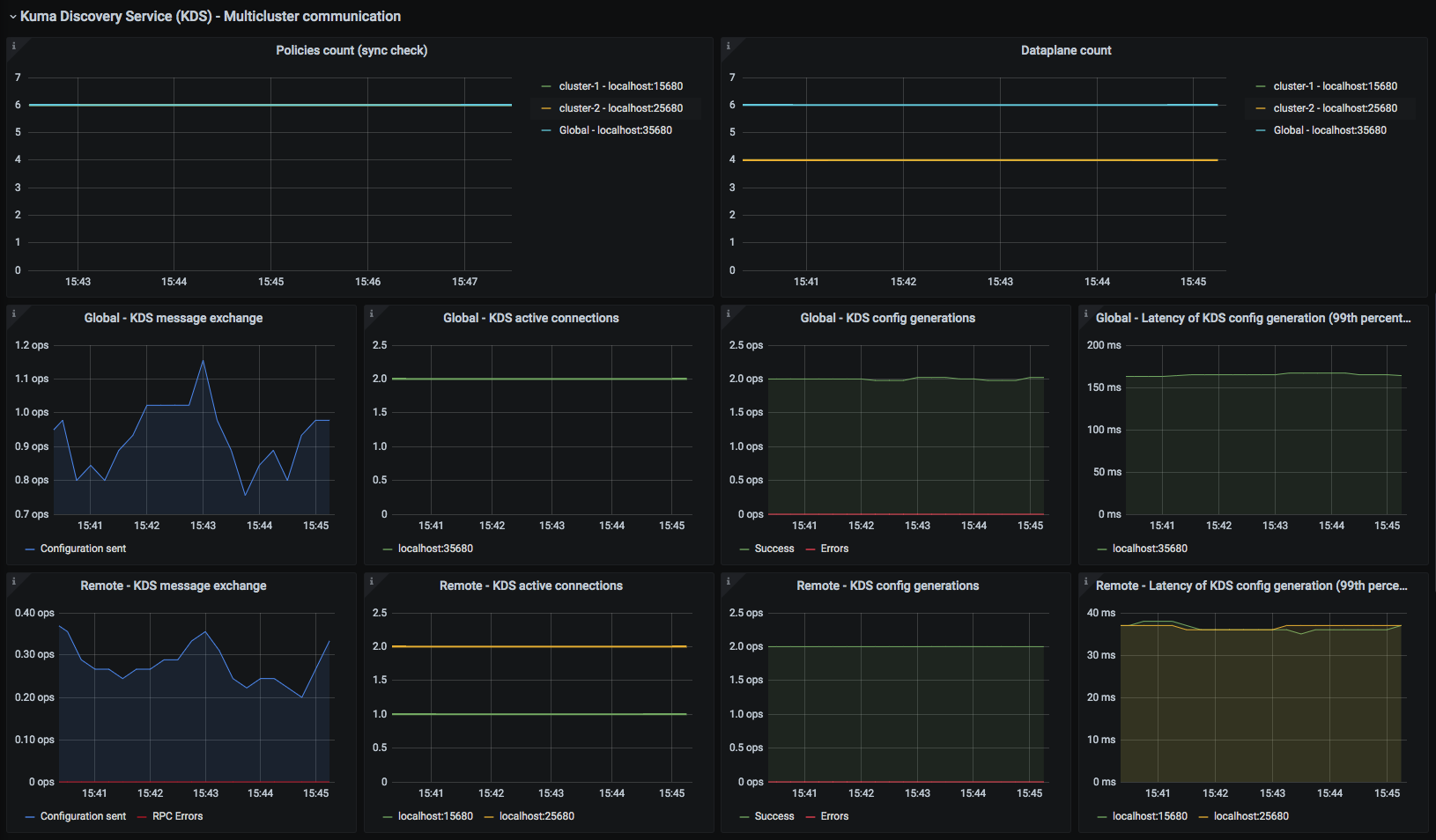 The Kuma CP dashboard uses the prometheus data source to create a Grafana dashboard with the graph, stat and table panels.