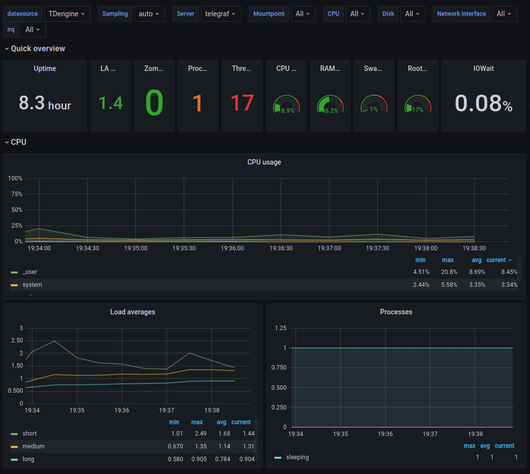The telegraf dashboard comes from the top 1 downloaded dashboard - which downloaded 21k times - with InfluxDB data source, completely ported to TDengine with its data source plugin.