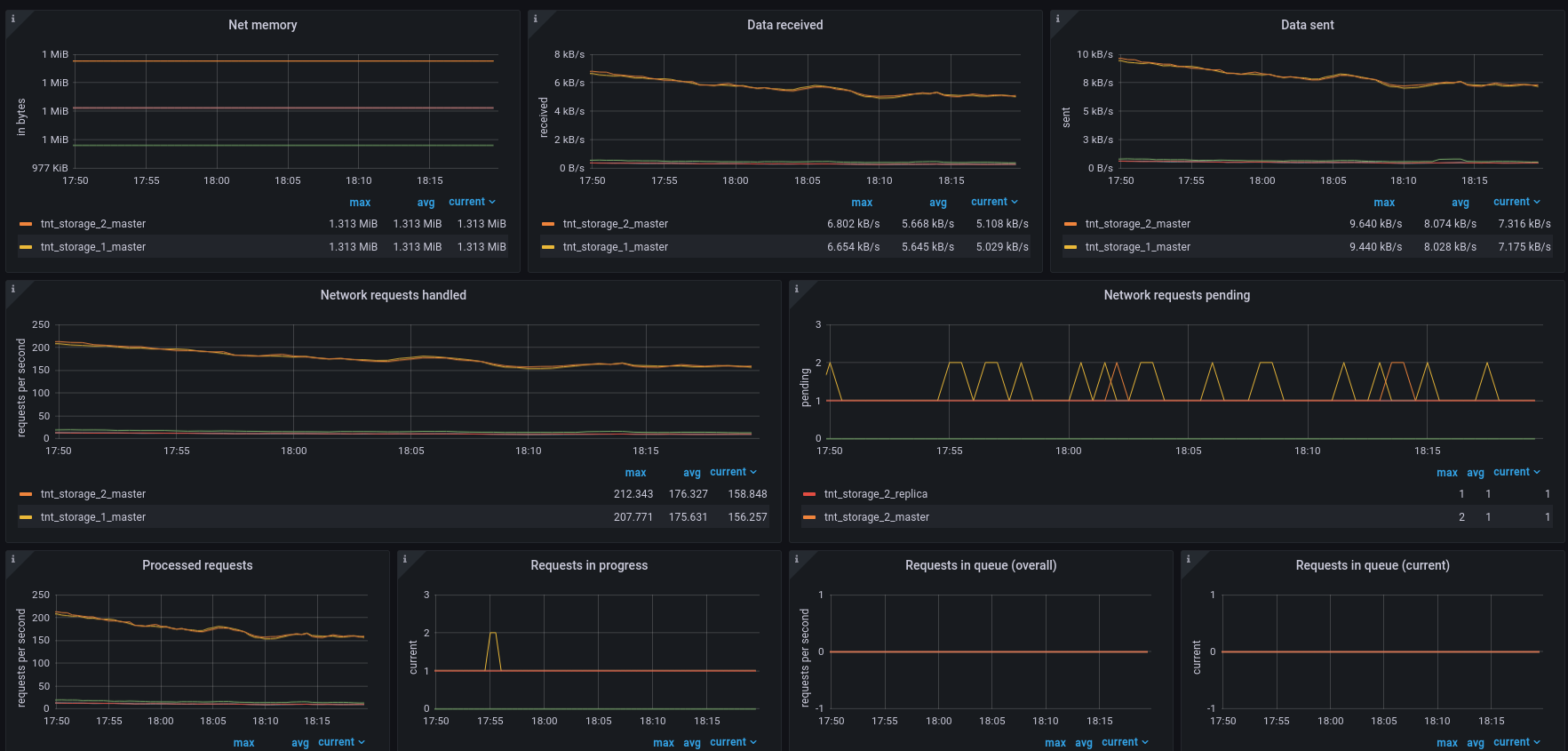 Metrics related to runtime. Contains Lua and transaction memory panels, fiber statistics panels and event loop panel.