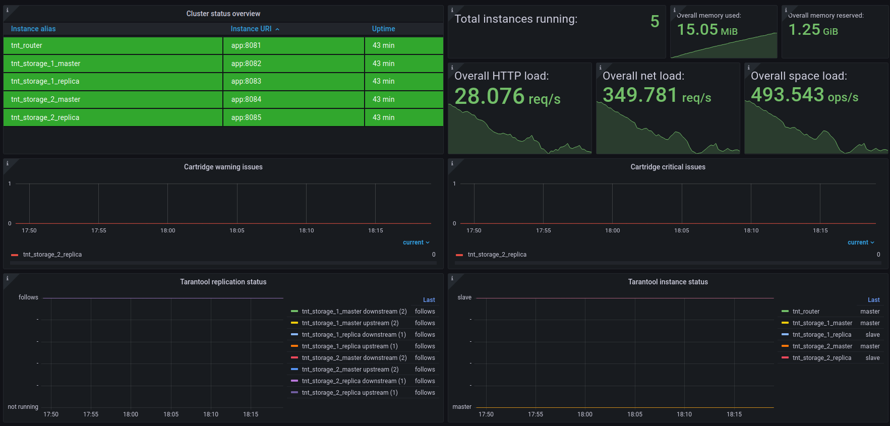 Contains several cluster overview panels, providing some aggregated info on cluster instances health, overall load and memory stats. Also contains panels on Cartridge issues count, read only status and switchover triggers, election info.