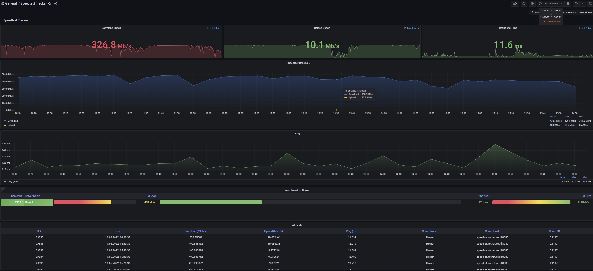 This dashboard shows data collected by Speedtest Tracker (https://github.com/henrywhitaker3/Speedtest-Tracker) and exported in an InfluxDBv1 database witch is connected to InfluxDBv2 bucket.