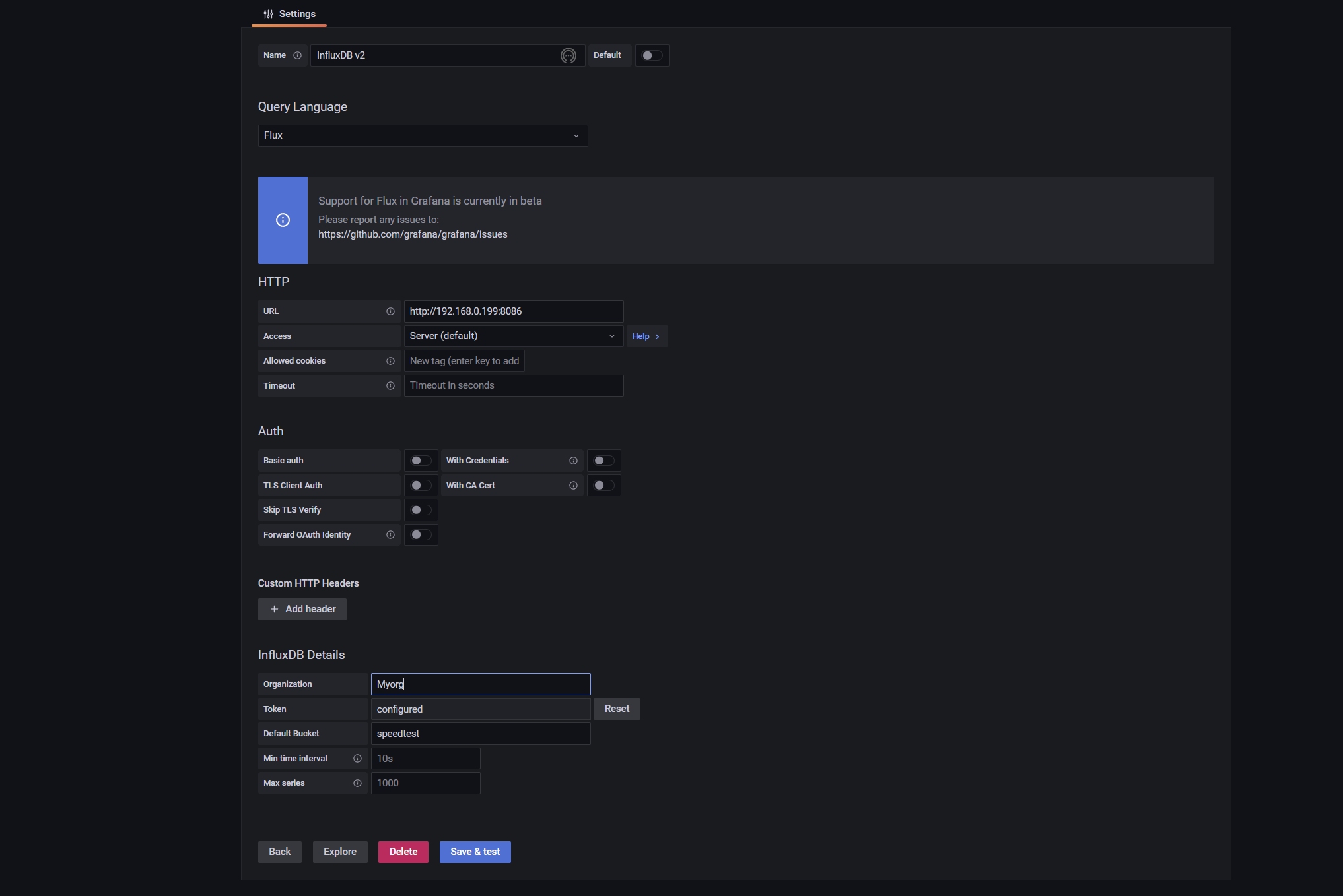 Configure Grafana to use with data from InfluxDBv2 ( select datasource = InfluxDB , Query Language = Flux ,Organization = yourorg , Bucket = speedtest , Token = yourtoken for bucket )