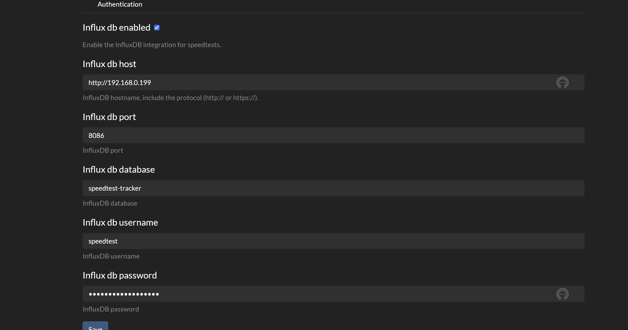 Config Client of InfluxDBv1(Speedtest-tracker) by entered data : db username, db pass , etc ...