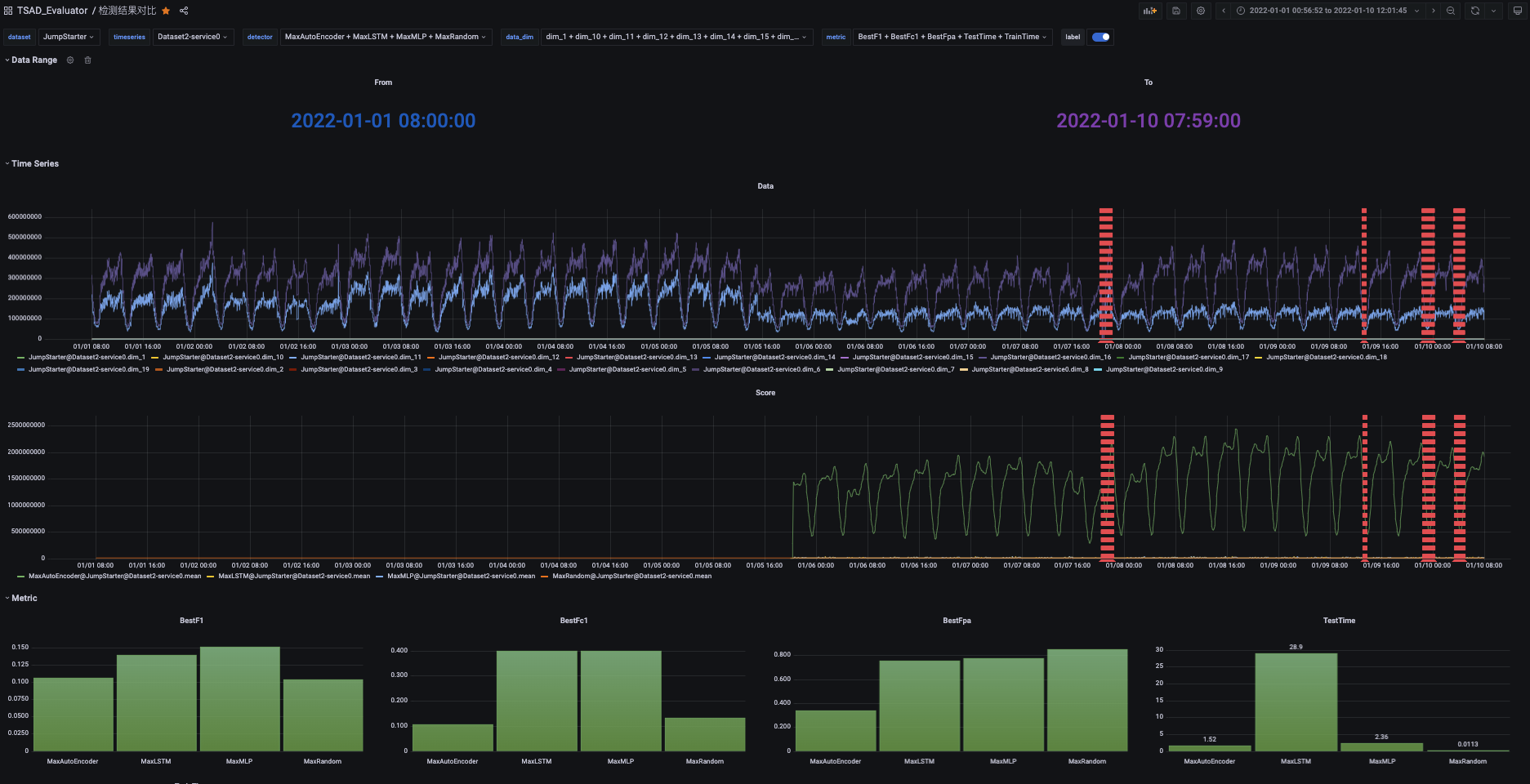 查看「多个选定算法」在「选定数据集」的「选定序列」上的异常分数、检测耗时和指标对比