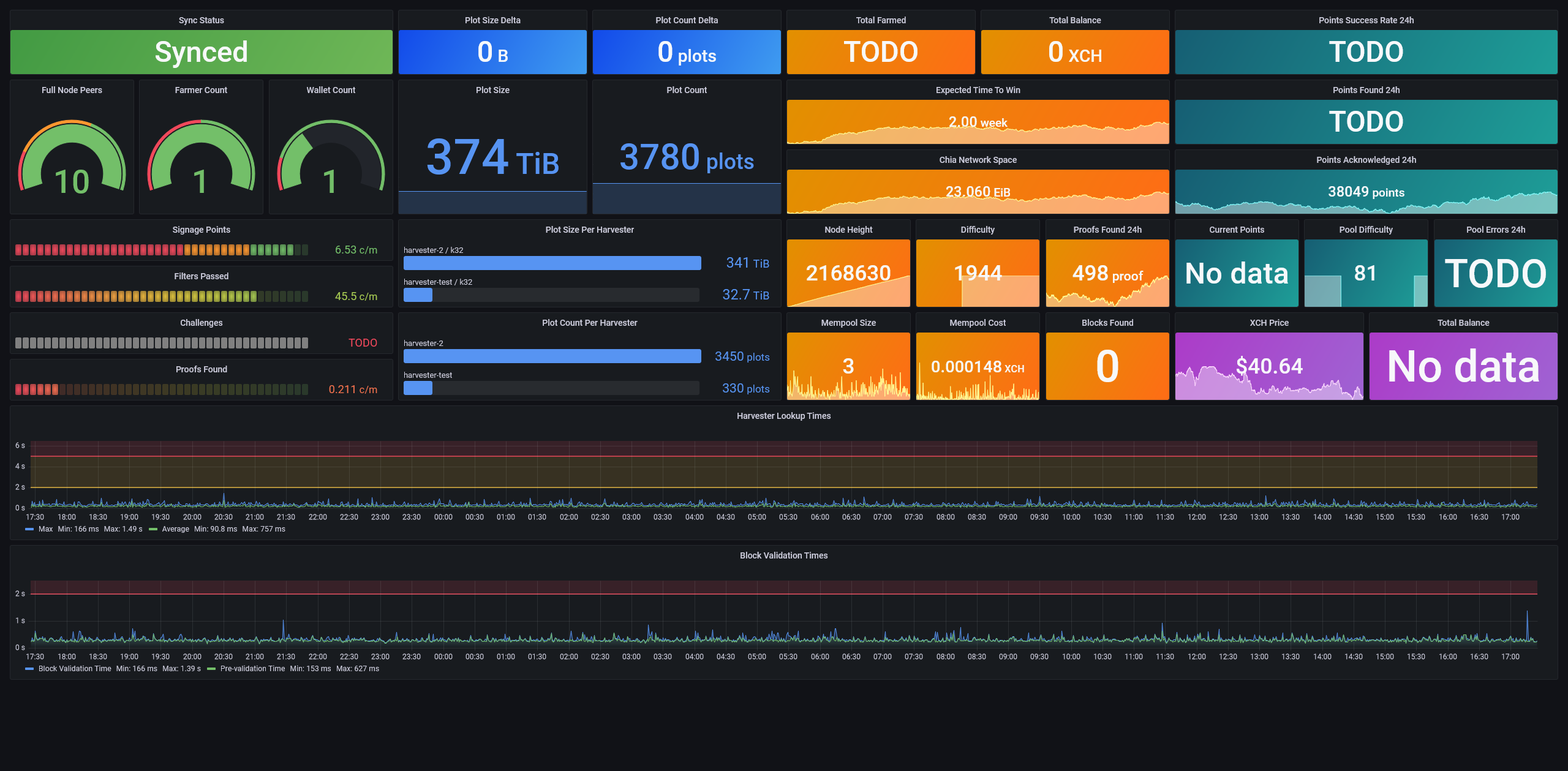 Displays all important metrics from your Chia farming node and all connected harvesters, collected by the official chia-exporter. This dashboard is based on the great work made by philippnormann (https://grafana.com/grafana/dashboards/14544)