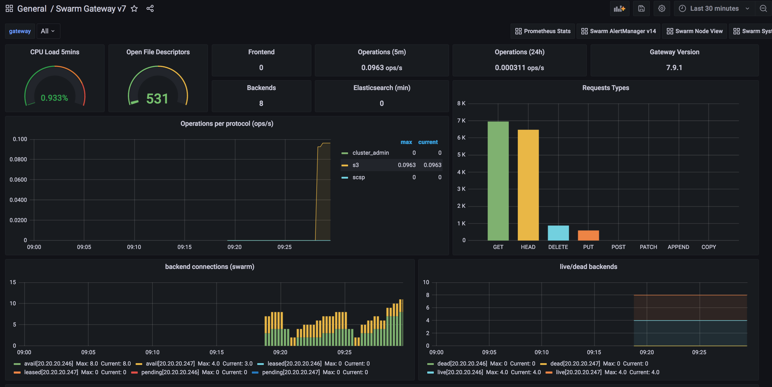 This dashboard is an example of how to visualize metrics provided by DataCore Swarm Content Gateway v7 and above. Note: some statistics will only show a value once you have done some S3 operations against the gateway.
