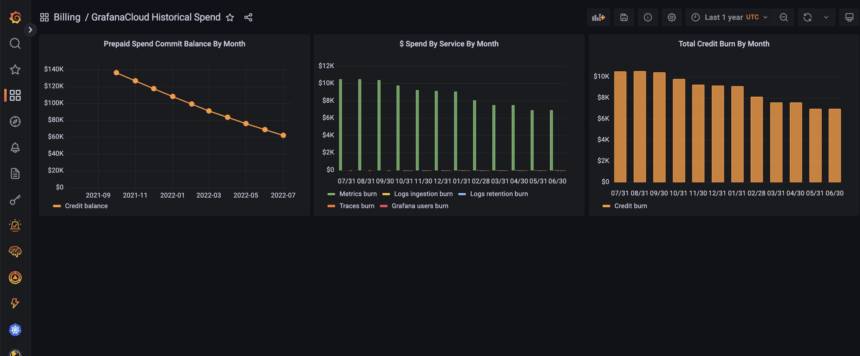 This is for Grafana Cloud Committed-spend customers to see your monthly spend. See how quickly you are burning down through your spend-commit, and which GrafanaLabs products you are spending on.
