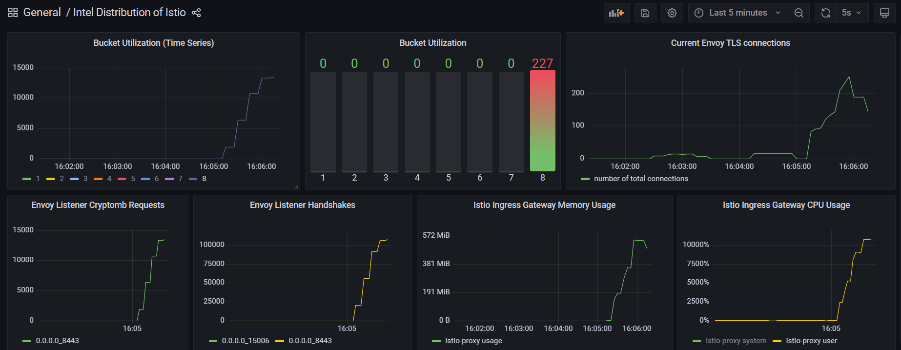 The Intel Distribution of Istio Grafana Dashboard includes visualization for CryptoMb private key provider feature. The dashboard represents CryptoMb TLS acceleration and how it works in action.