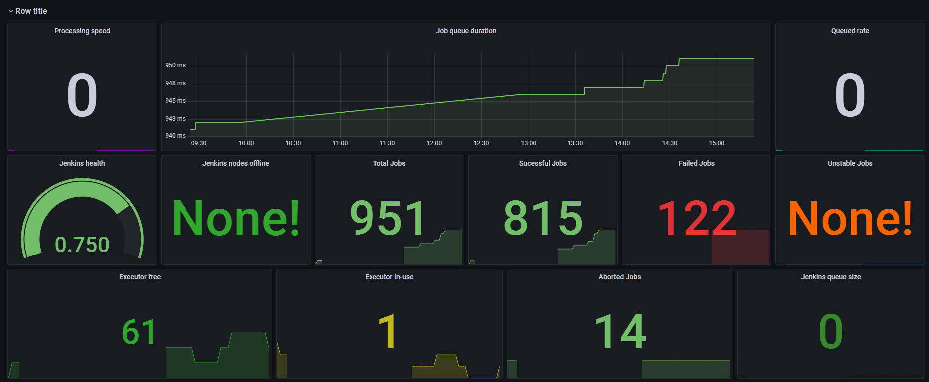 Jobs queue speeds and rates, Executors availability, Nodes status, Jenkins and JVM resource usage, Jenkins Job Status, and lot more.