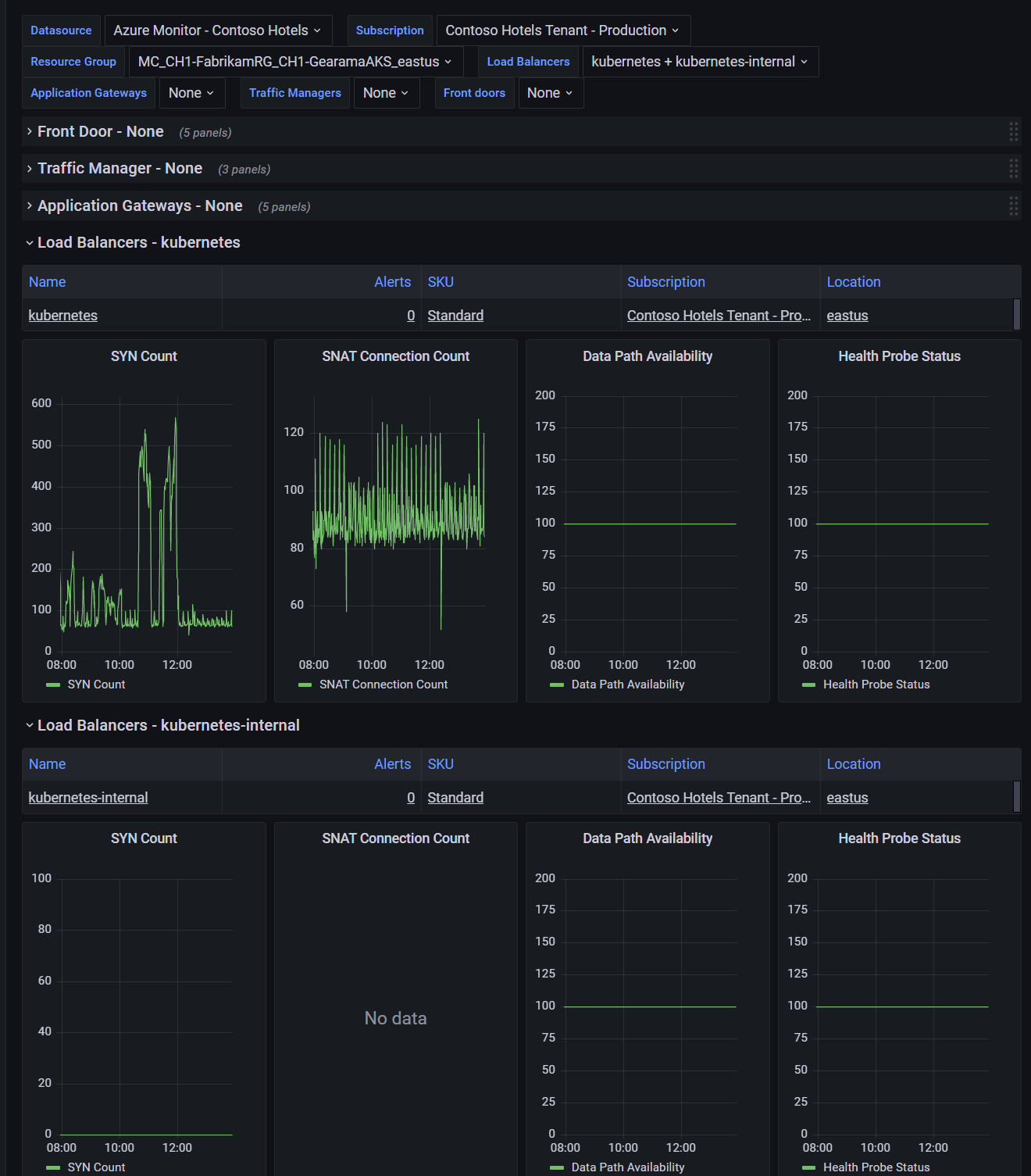 Using Azure Monitor data source, this dashboard provides insights for network monitoring. This monitoring is available for the following Azure services: Front Door, Traffic Manager, Application Gateways and Load Balancers.