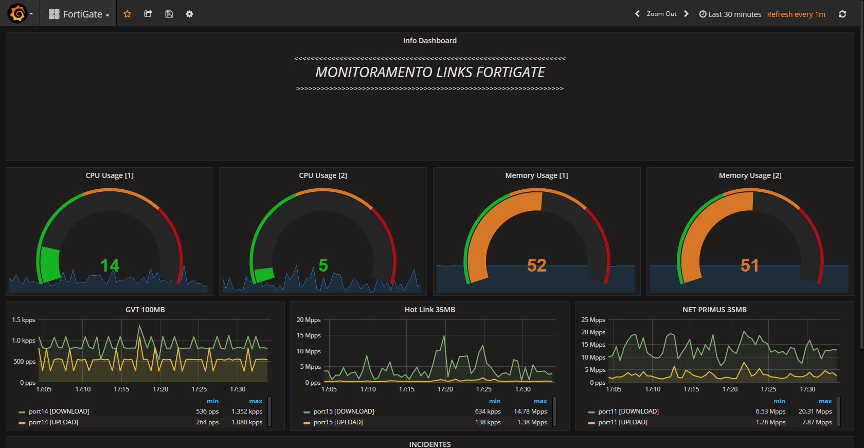 The FortiGate 200B dashboard uses the alexanderzobnin-zabbix-datasource data source to create a Grafana dashboard with the alexanderzobnin-zabbix-triggers-panel, graph, singlestat and text panels.