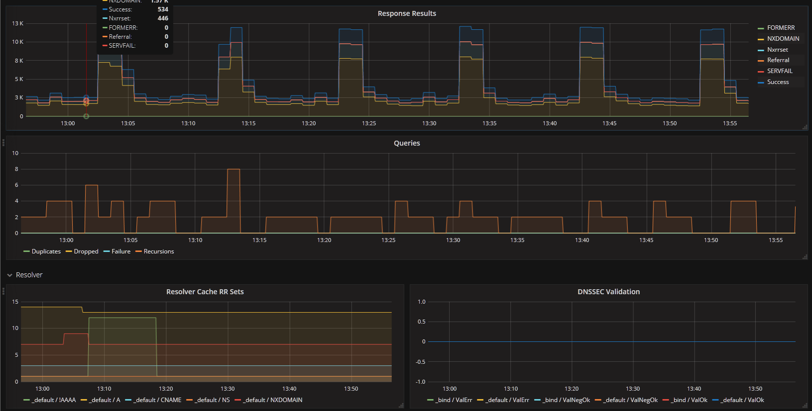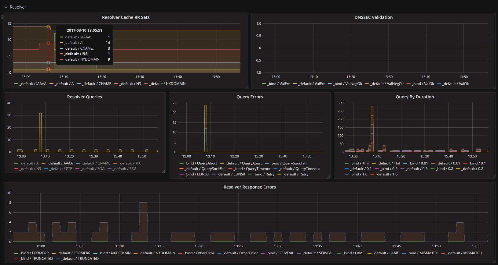 This dashboard is designed to display metrics collected by prometheus from the bind_exporter (ISC BIND DNS server). The bind_exporter is created by DigitalOcean and hosted on github.