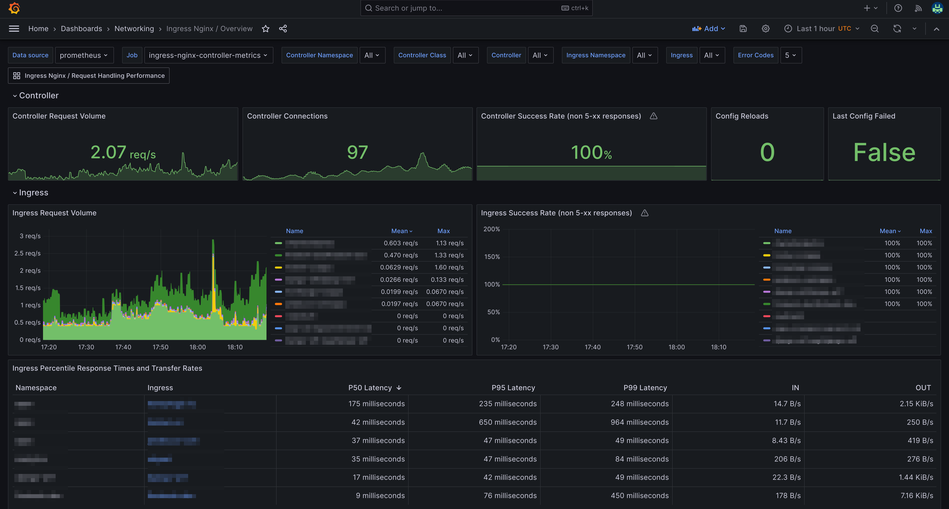 A dashboard that monitors Ingress-nginx. It is created using the (Ingress-Nginx-mixin)[https://github.com/adinhodovic/ingress-nginx-mixin]. Fully configurable using the mixin.