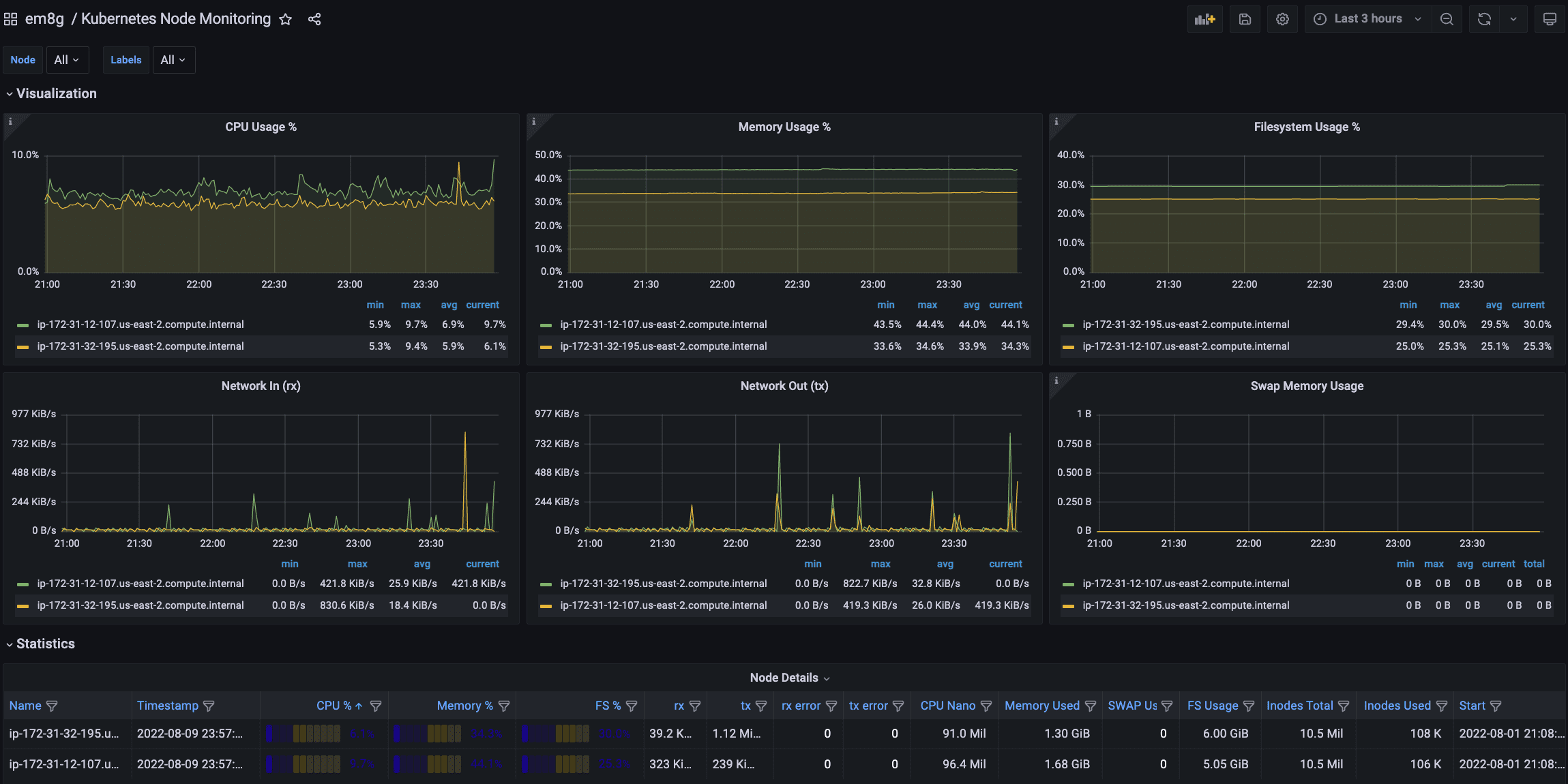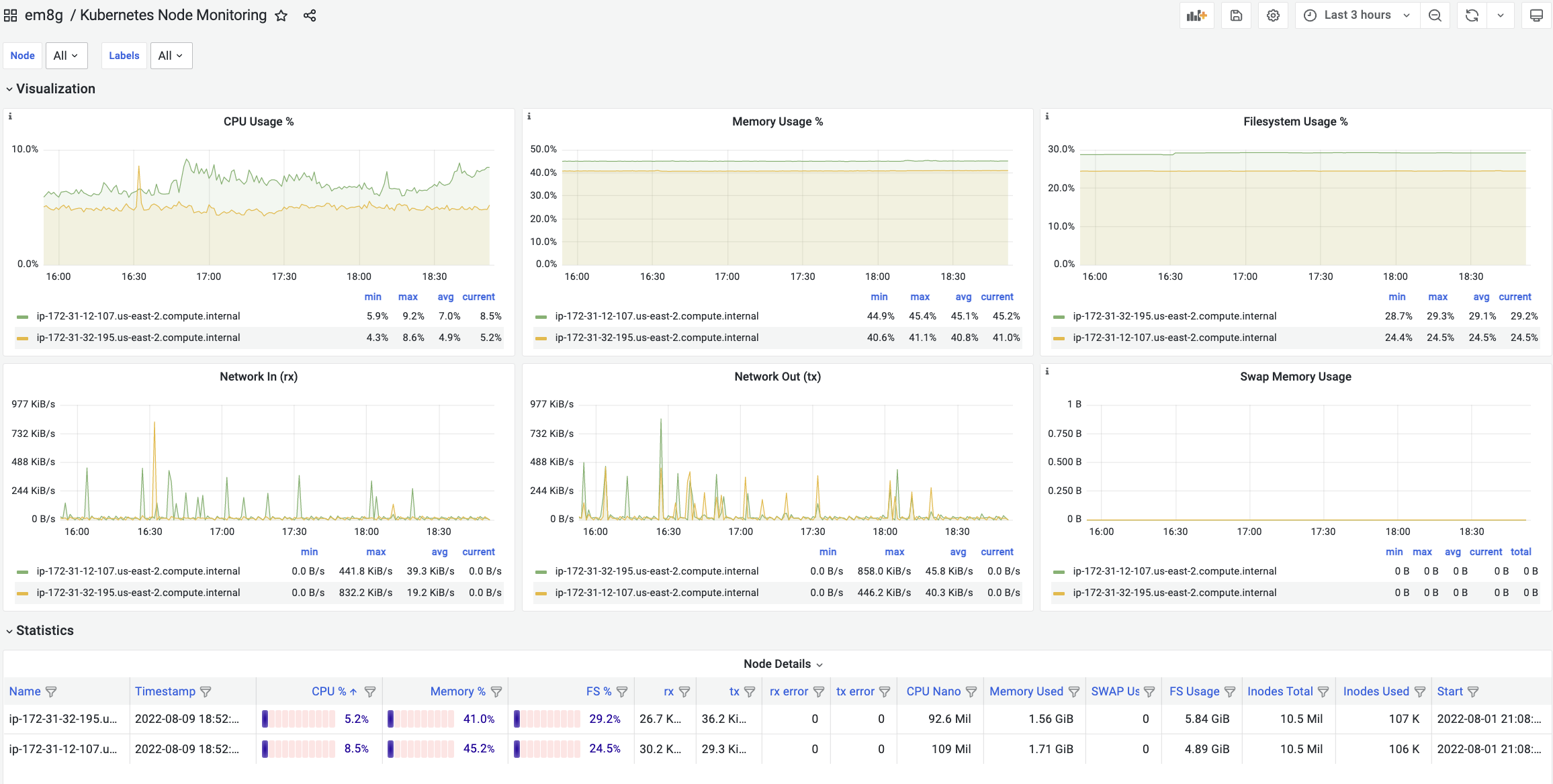 - Usage Trend of CPU, Memory, Filesystem, Network In/Out, Swap by Nodes