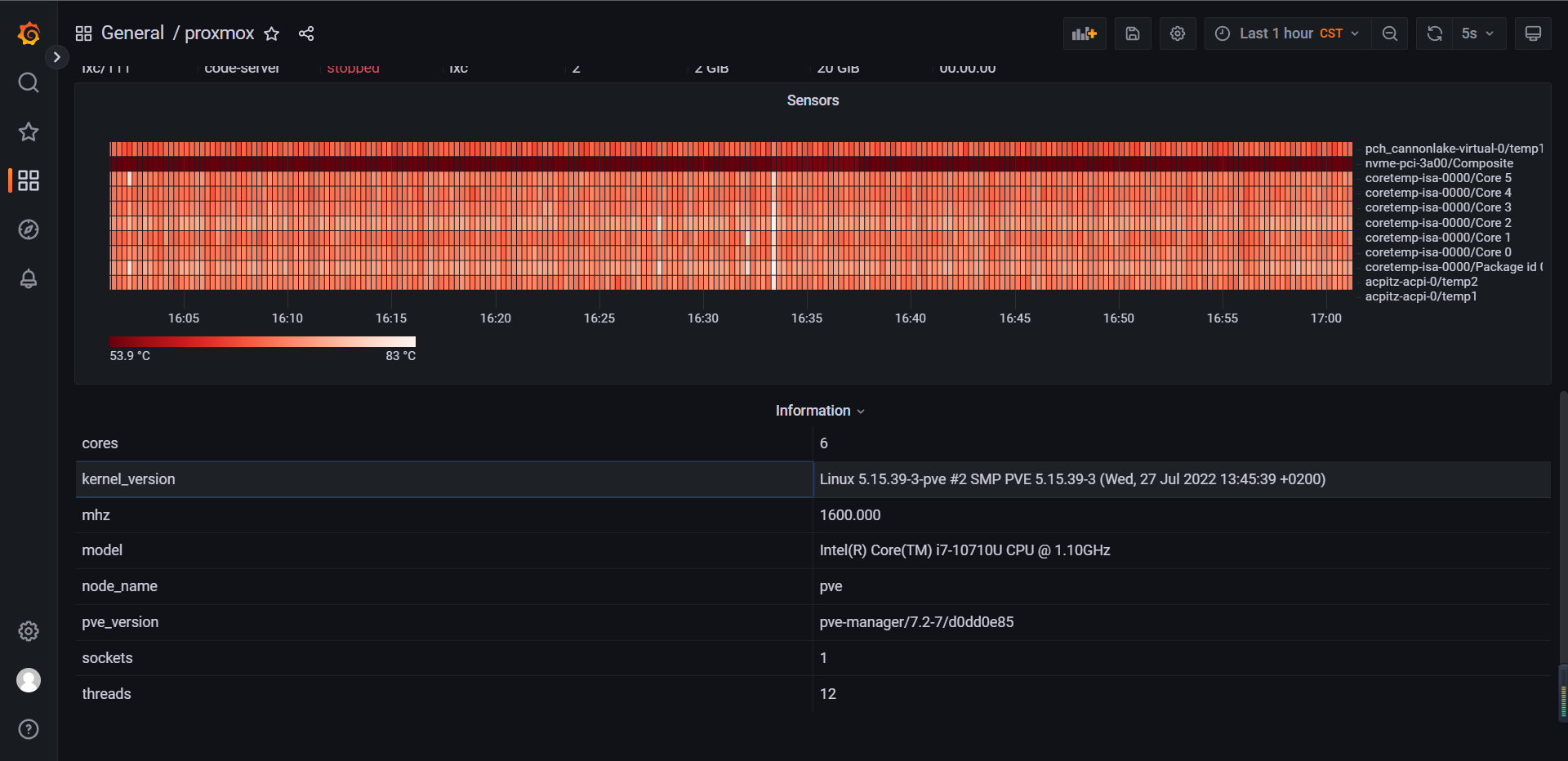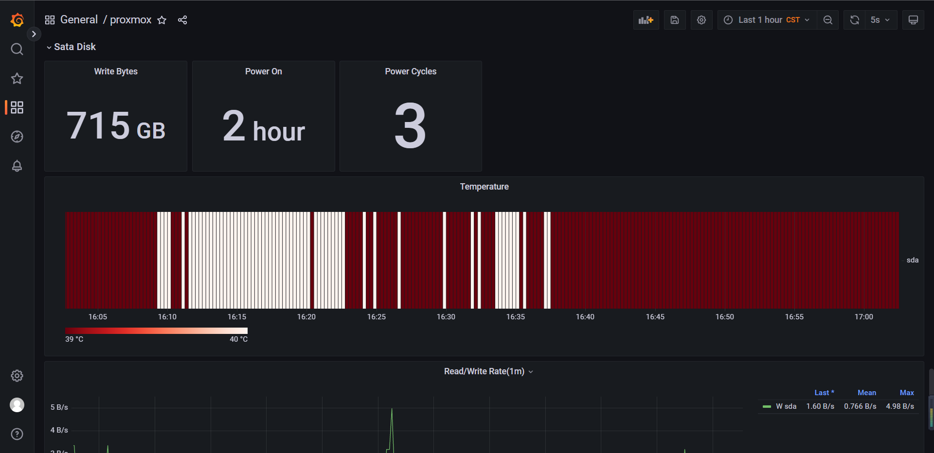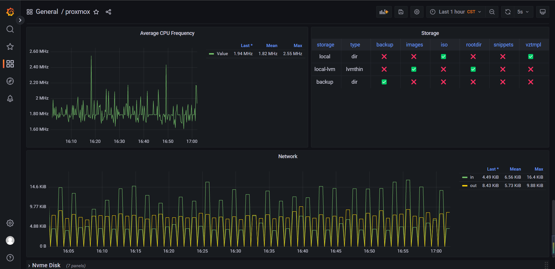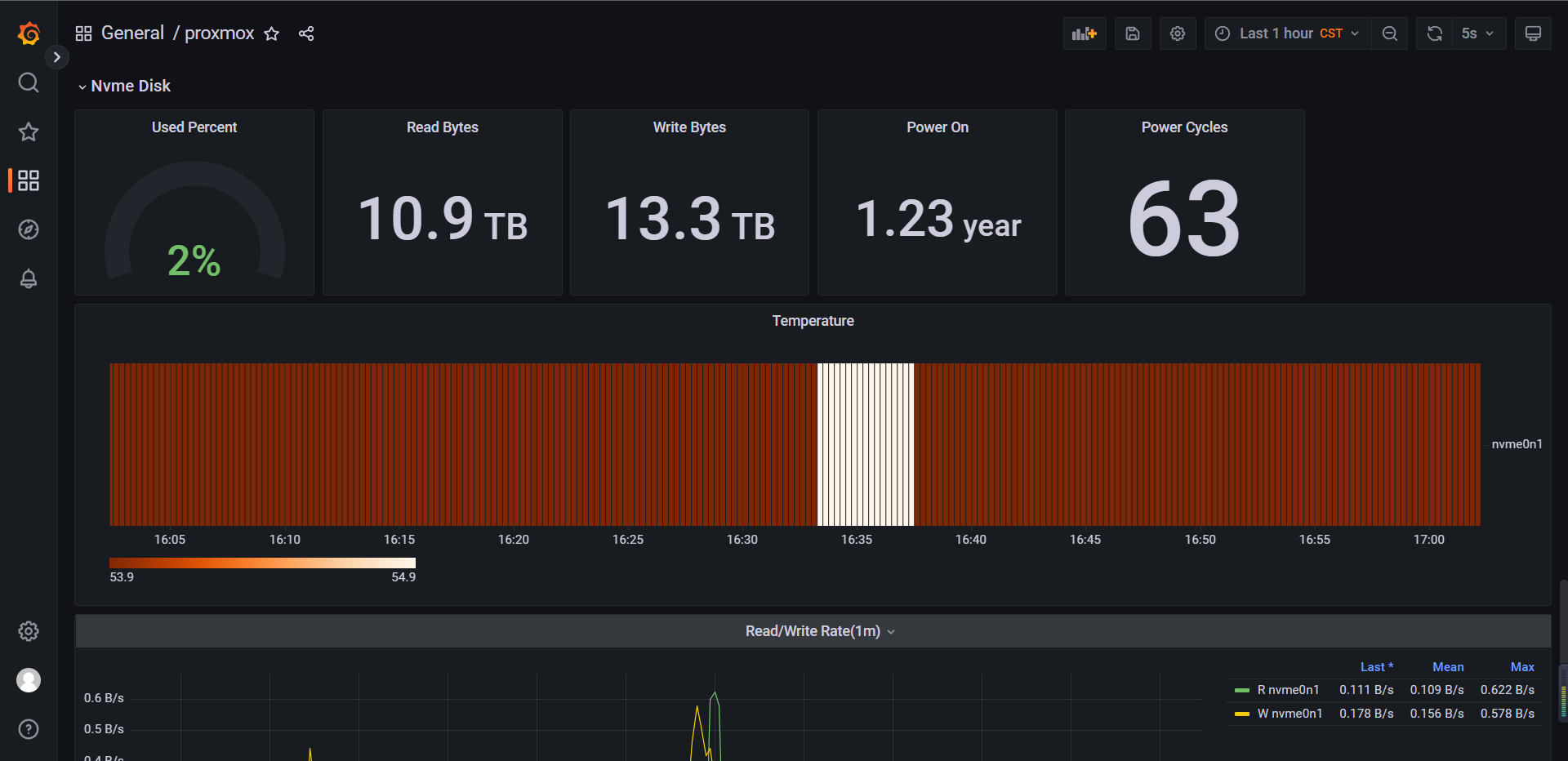 This dashboard shows the proxmox nodes information(cpu cores, cpu frequency, disk list, sensors temperature, ...), nvme/sata disk information(read/write bytes, power on hours, power cycles, ...), vm information(vm list, vm cpu/memory/disk usage, ...) and so on.