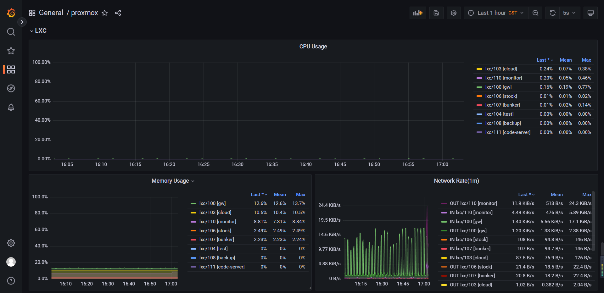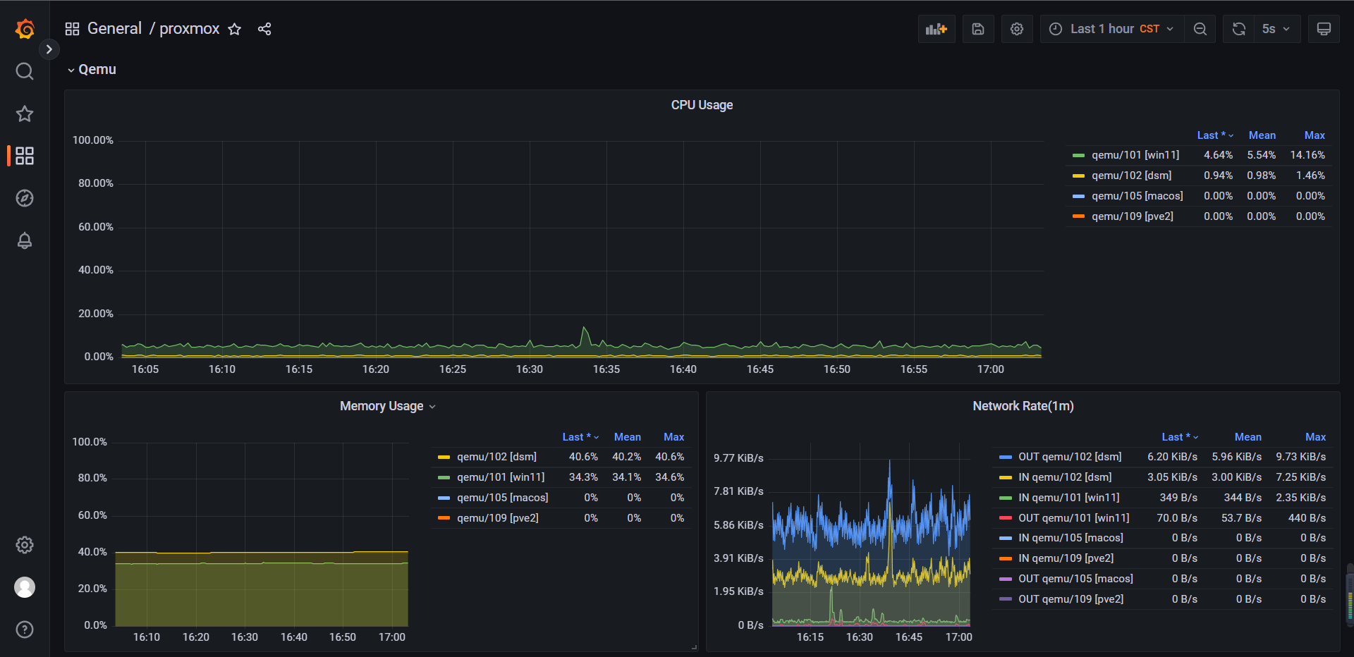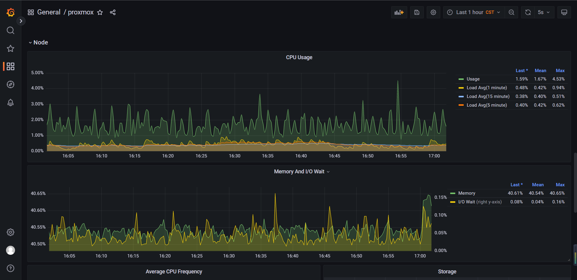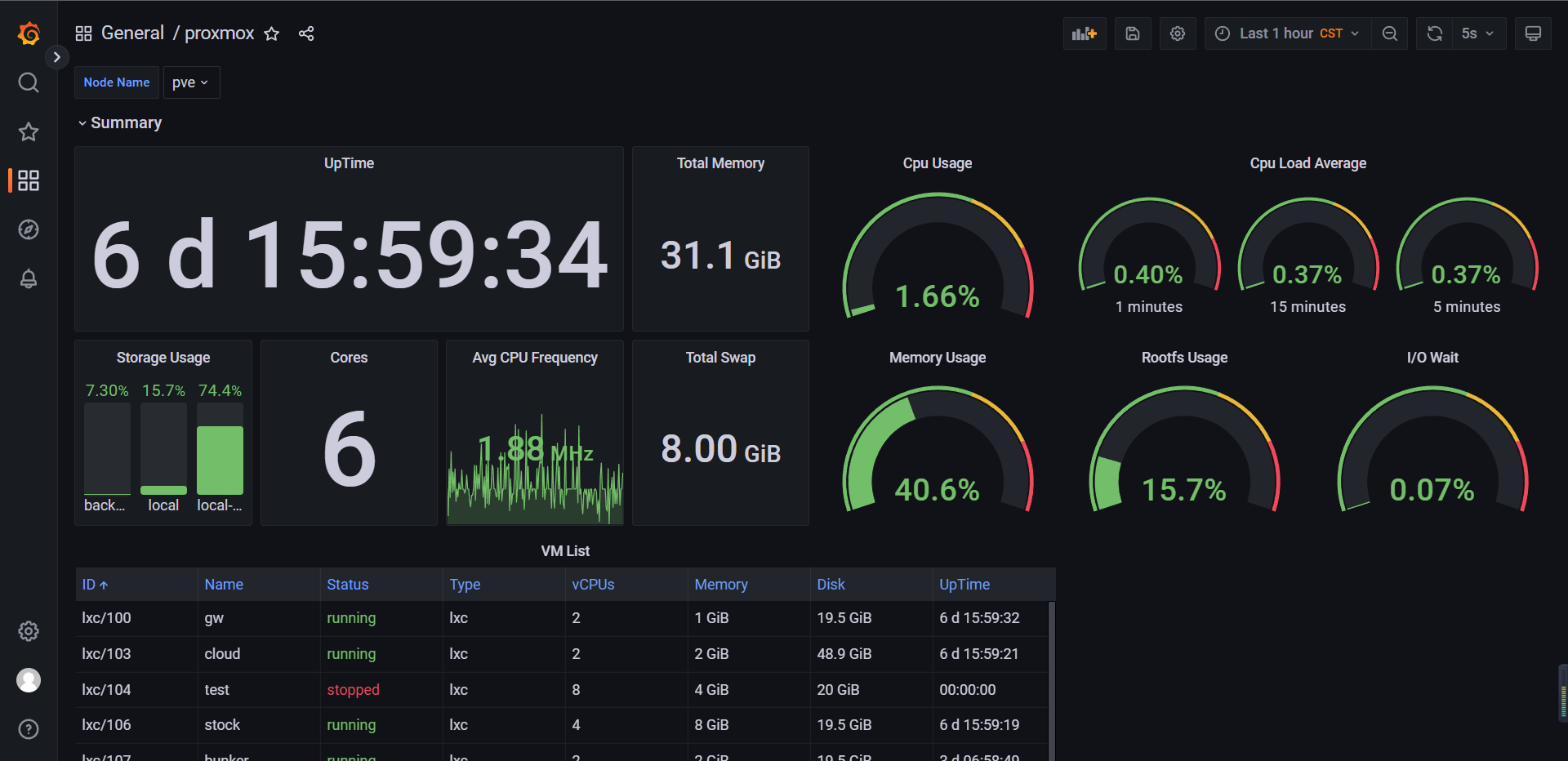 This dashboard shows the proxmox nodes information(cpu cores, cpu frequency, disk list, sensors temperature, ...), nvme/sata disk information(read/write bytes, power on hours, power cycles, ...), vm information(vm list, vm cpu/memory/disk usage, ...) and so on.
