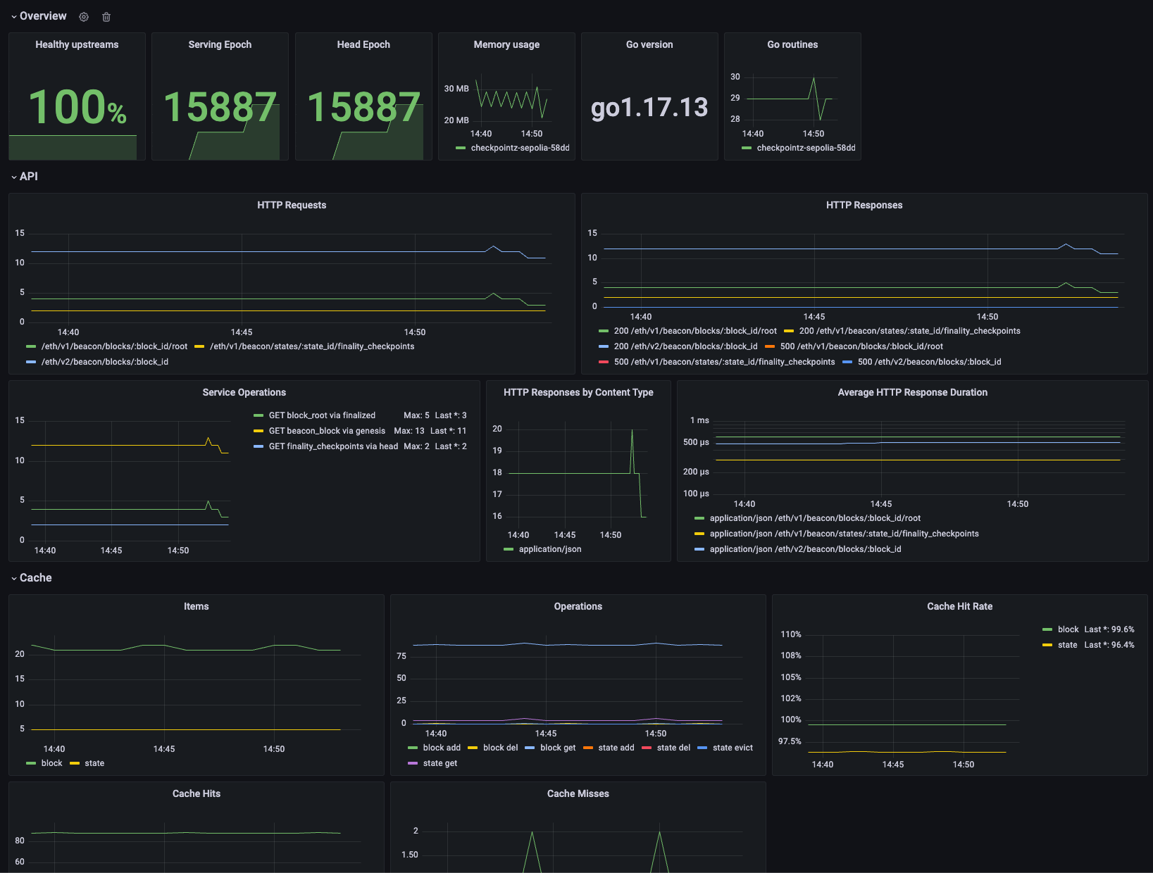 The Checkpointz dashboard uses the prometheus data source to create a Grafana dashboard with the stat and timeseries panels.