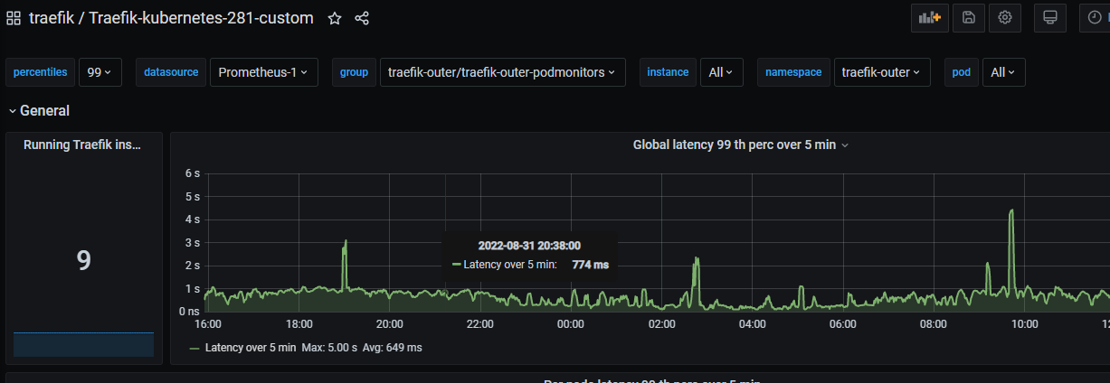 This dashboard adds group, instance, datasource, namespace, pod and other variables to the official traefik kubernetes.