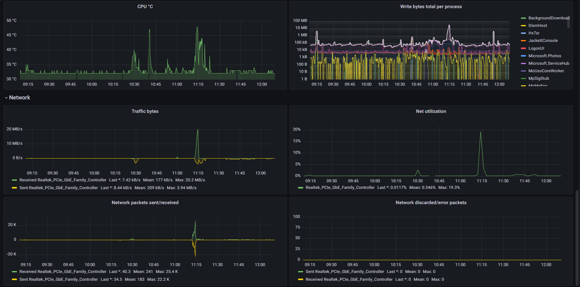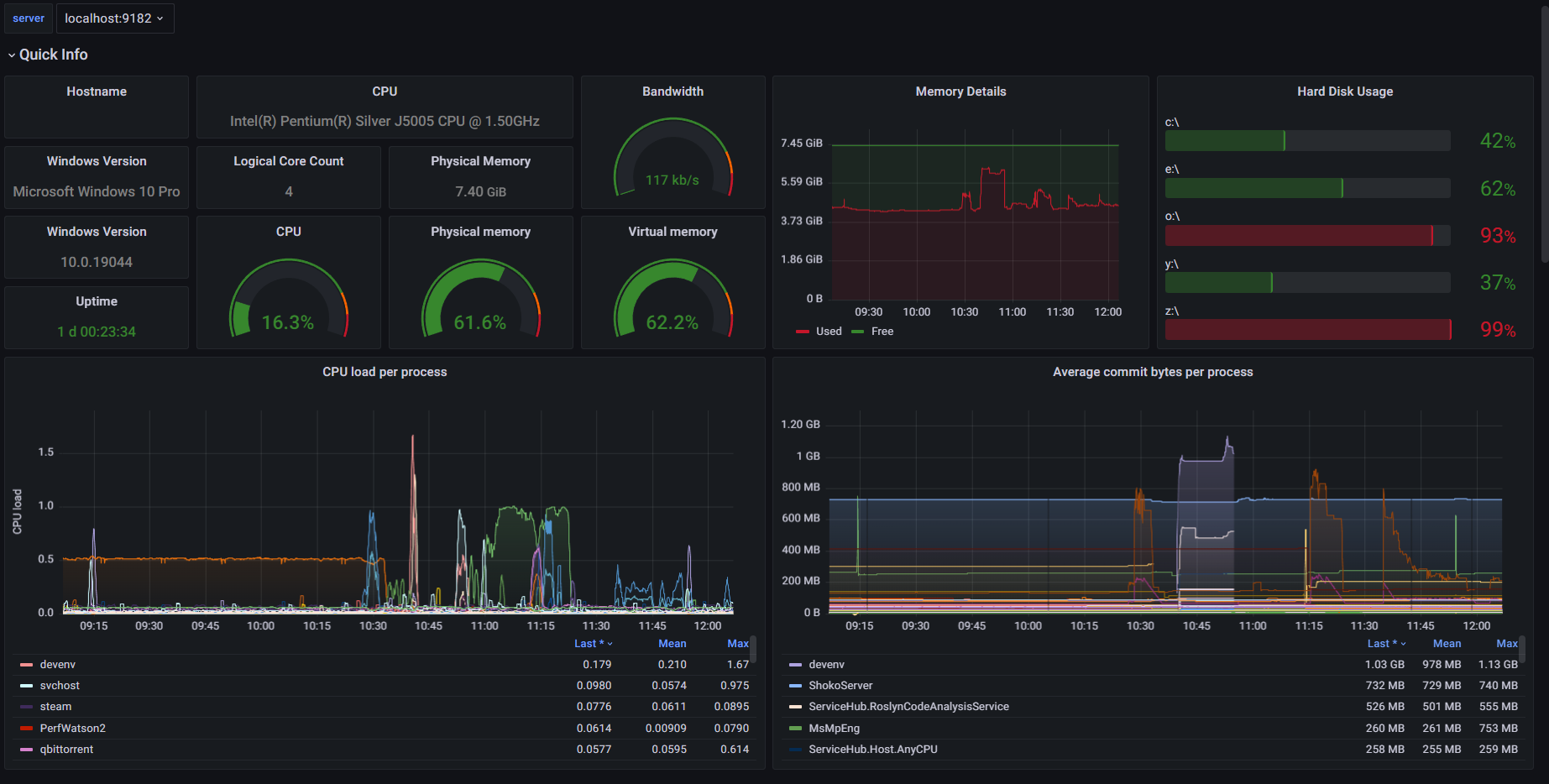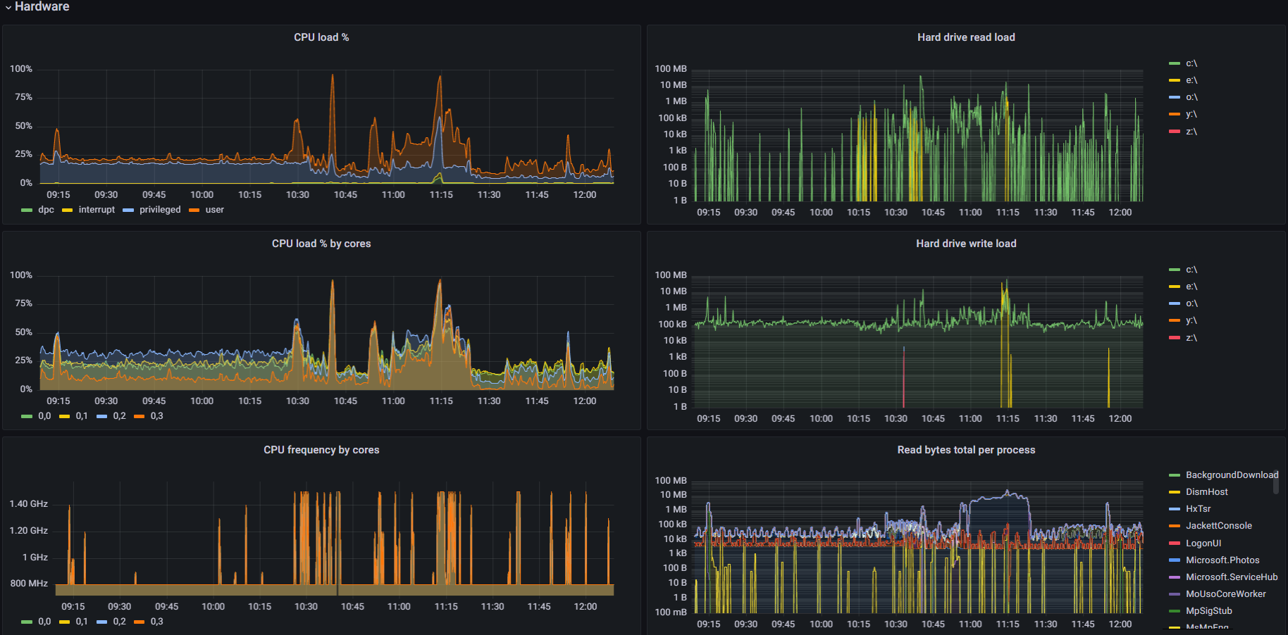 - Windows exporter with "cpu,cpu_info,cs,logical_disk,net,os,service,system,textfile,cpu_info,memory,process,time,thermalzone" collectors enabled