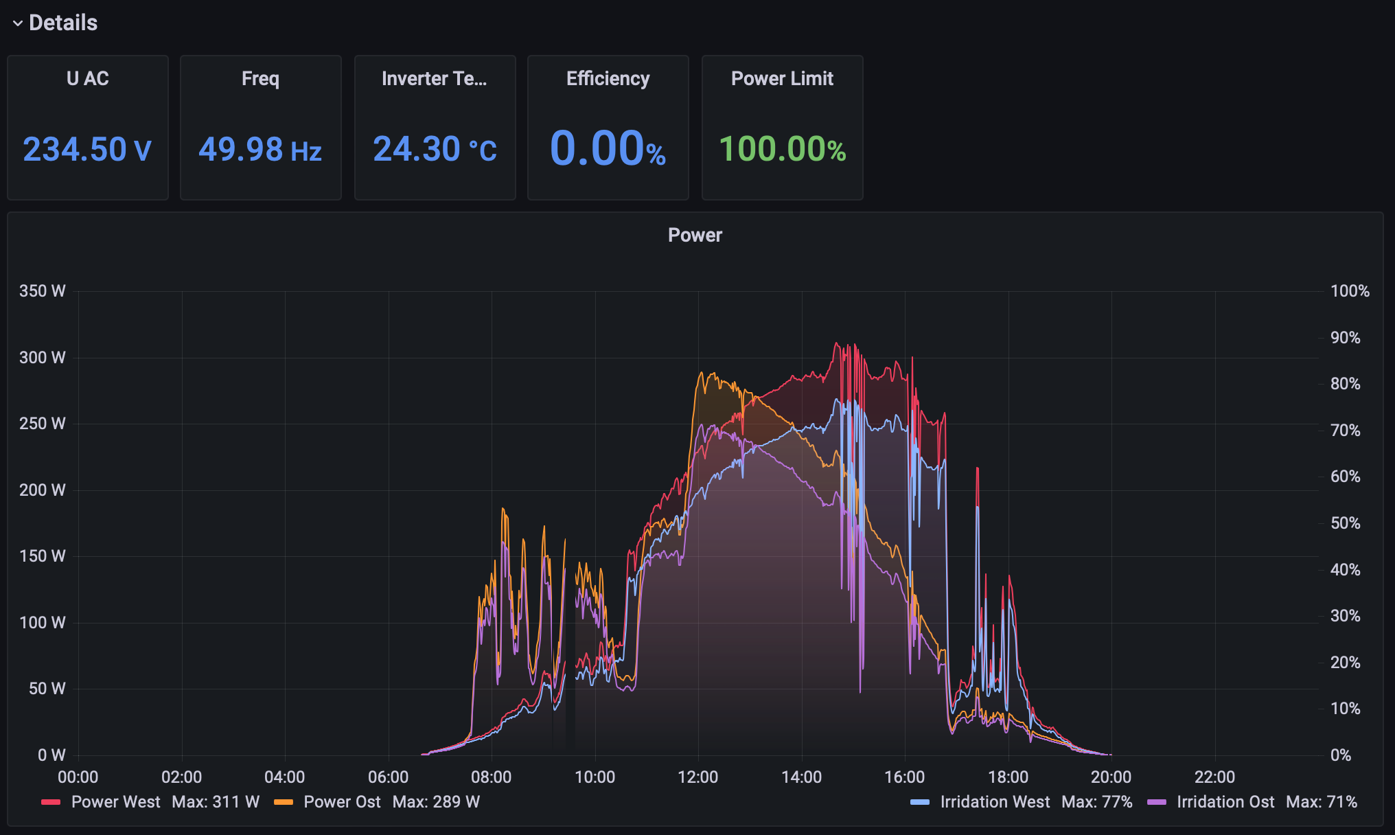 Architecture: Inverter -> Ahoy-DTU (ESP8266) -> MQTT (mosquitto) -> Telegraf -> InfluxDB -> Grafana