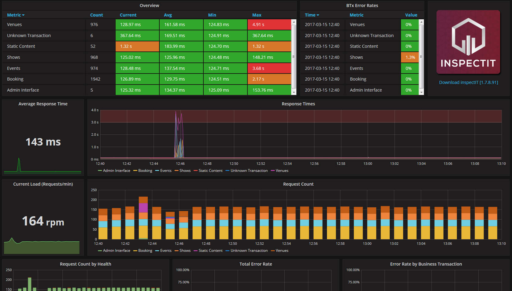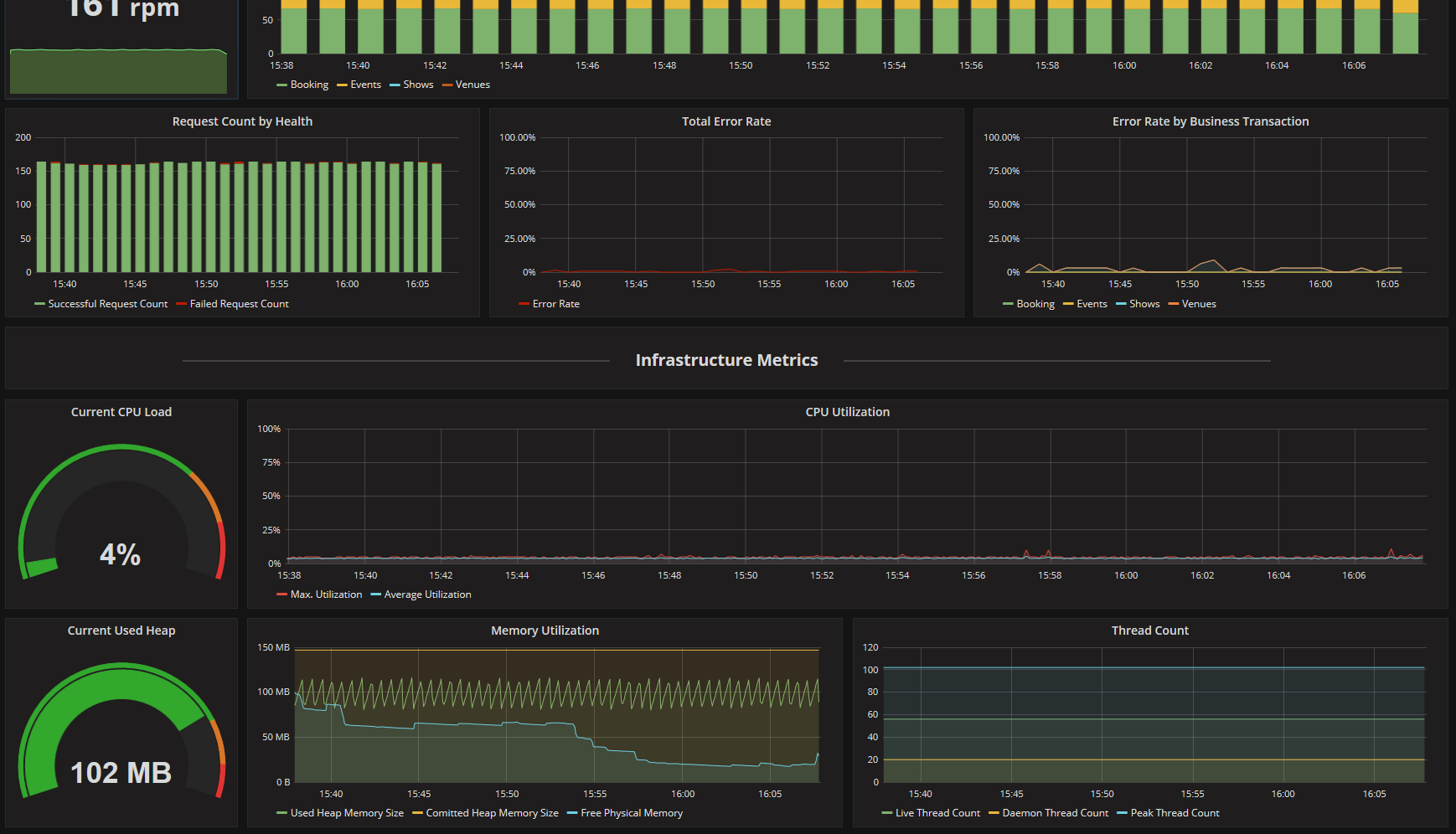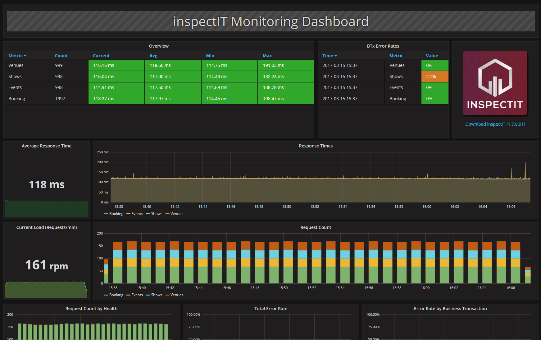 This dashboard visualizes metrics collected by inspectIT and stored in an InfluxDB. Metrics which are related to a concrete business context as well as pure technical metrics like CPU utilization or response times are shown in this dashboard.
