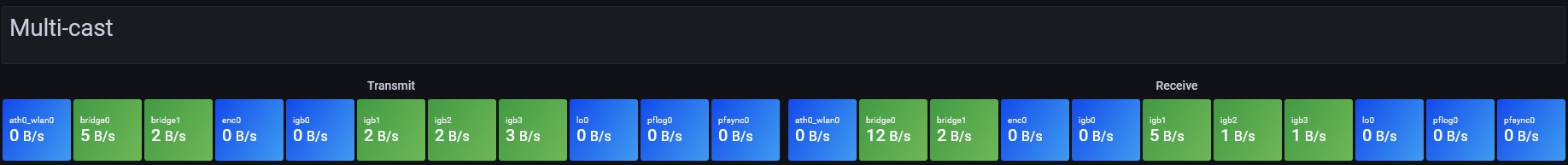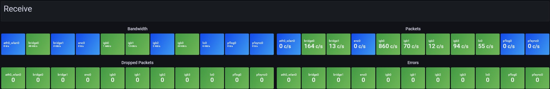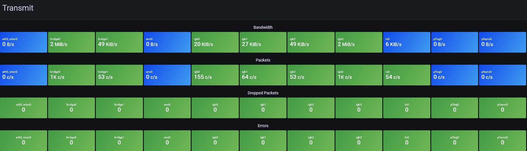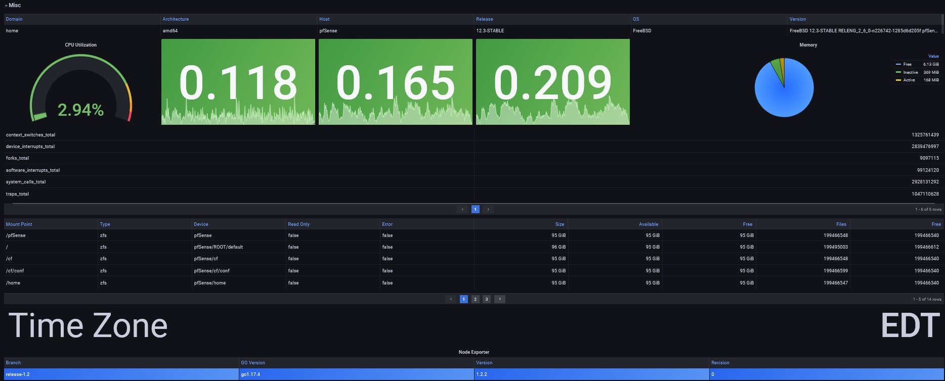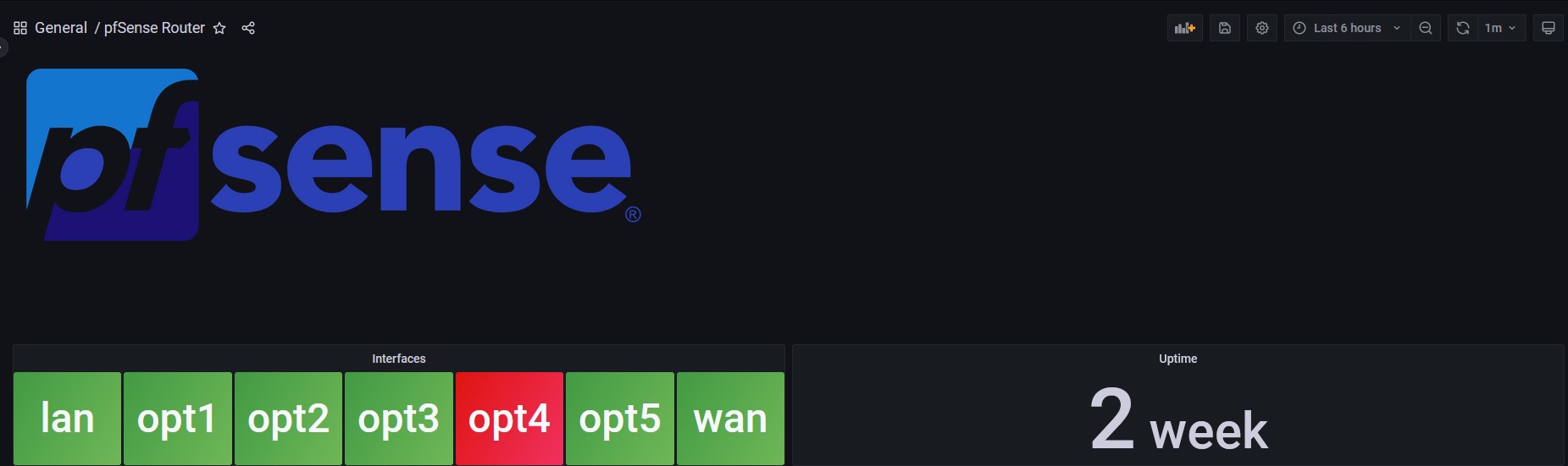 The pfSense Router dashboard uses the prometheus data source to create a Grafana dashboard with the gauge, piechart, stat, table and text panels.