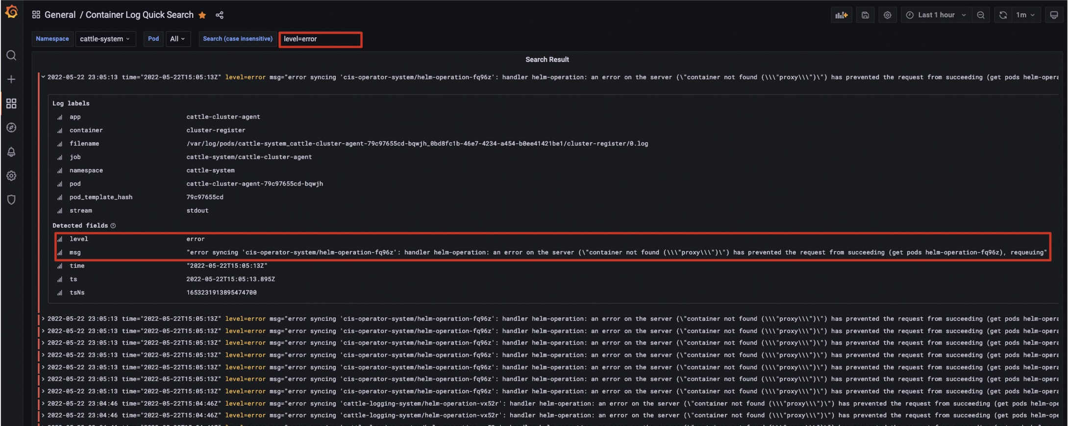 The Container Log Quick Search dashboard uses the loki data source to create a Grafana dashboard with the logs panel.