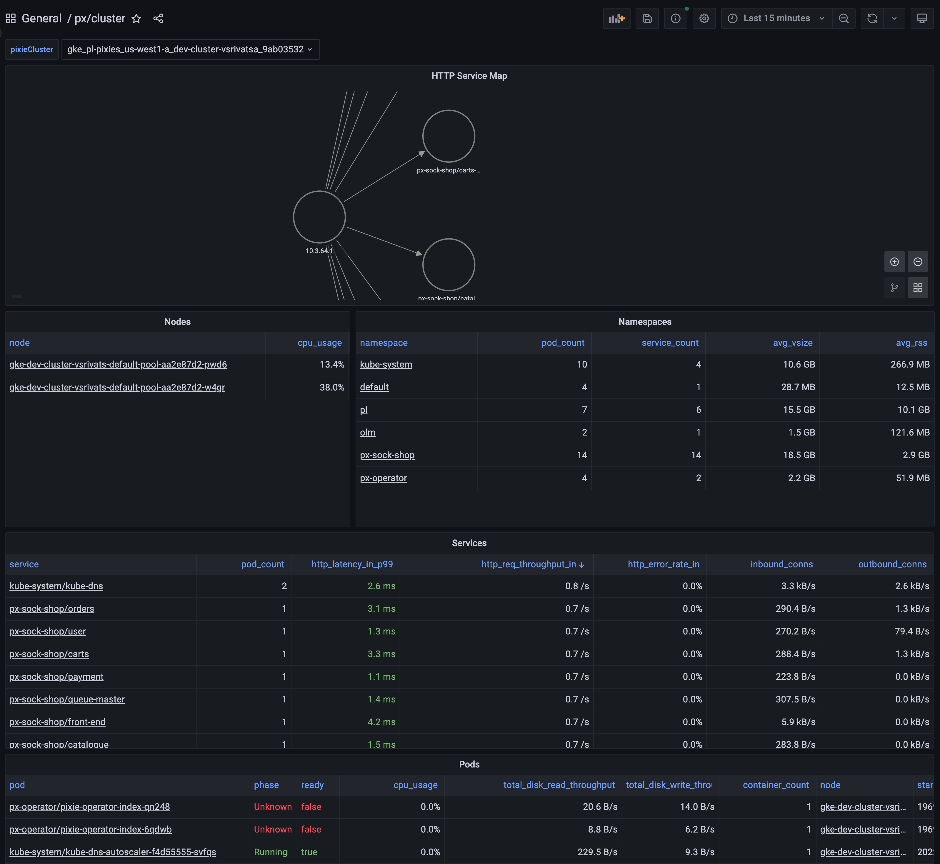 Dashboard includes a service map of the HTTP traffic between the services in your cluster, along with the latency, error rate, and throughput per service. It also lists the nodes, namespaces and pods available in your cluster.