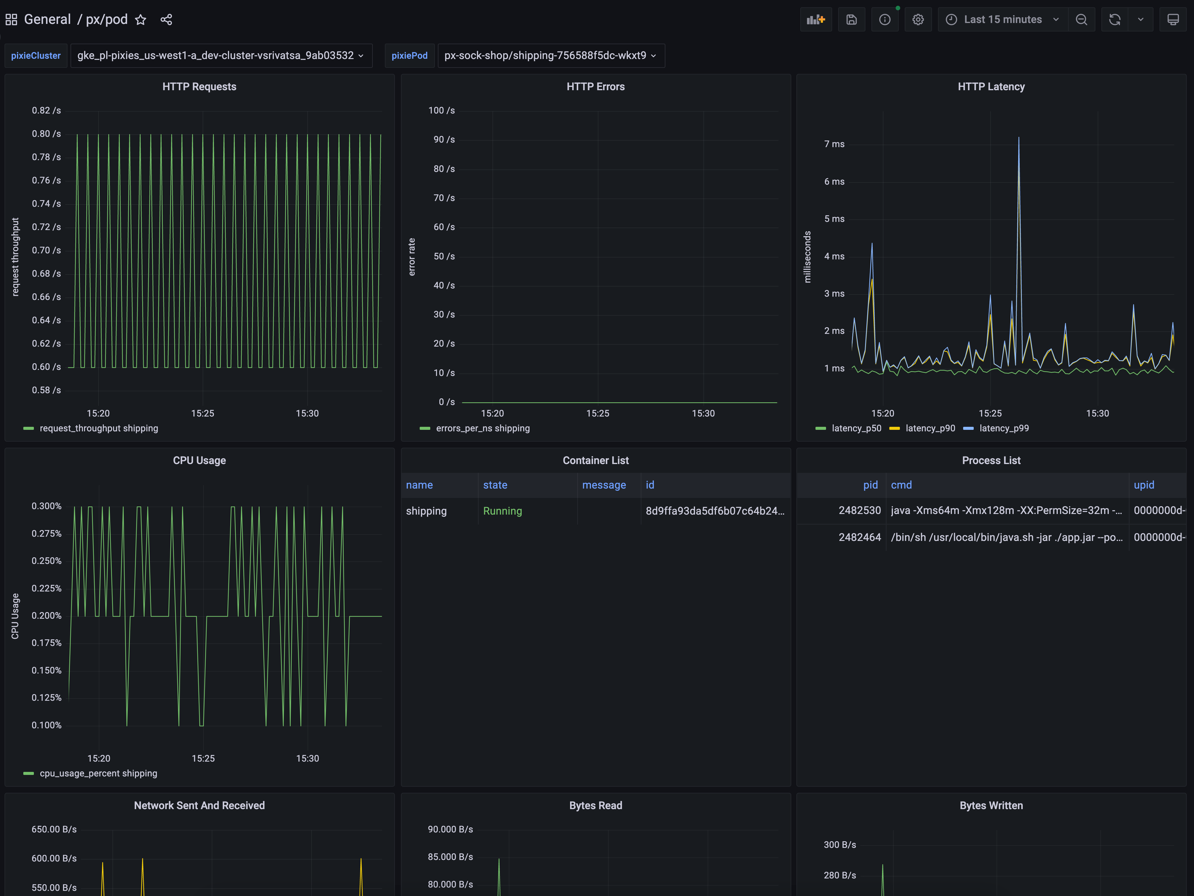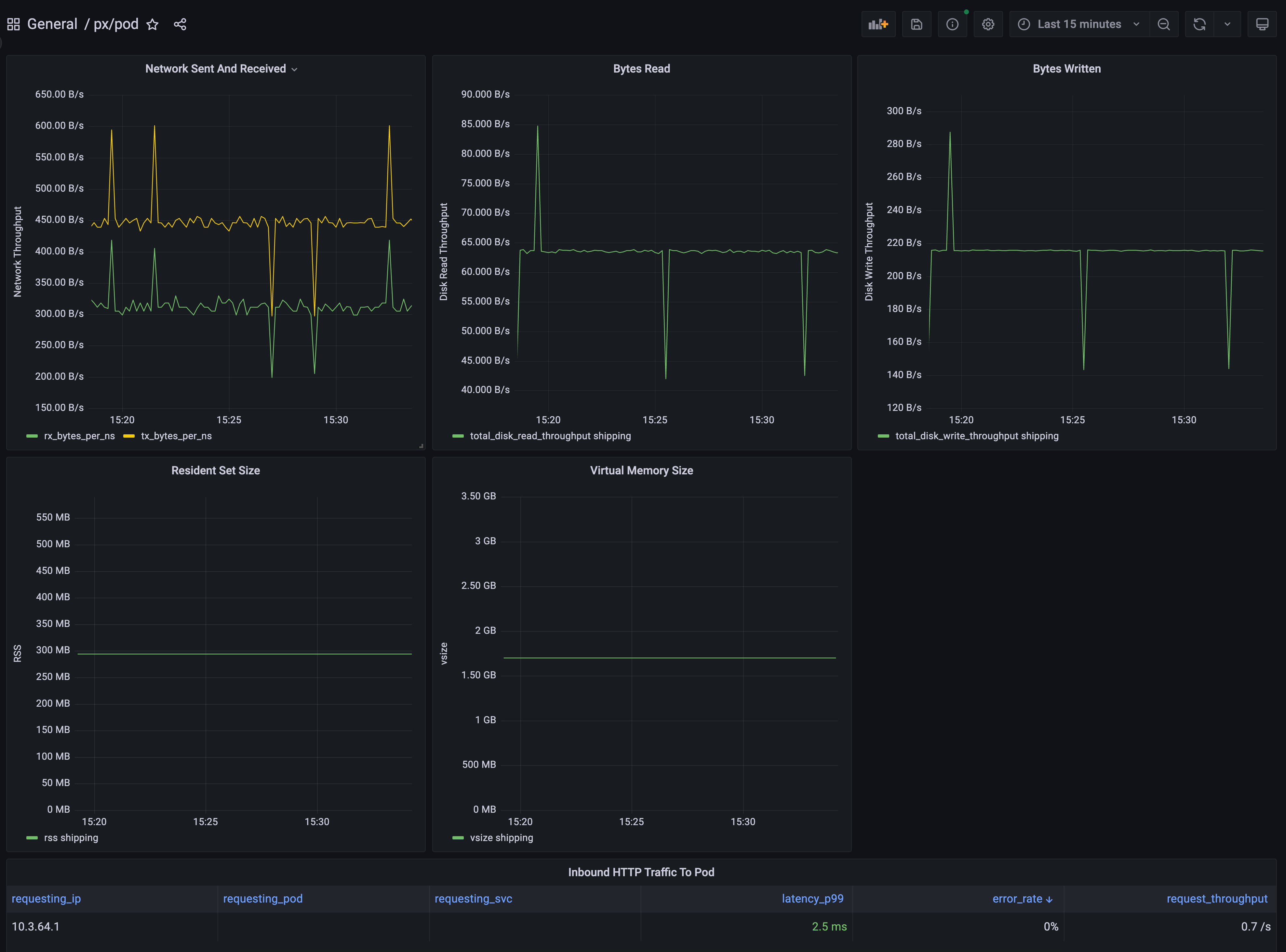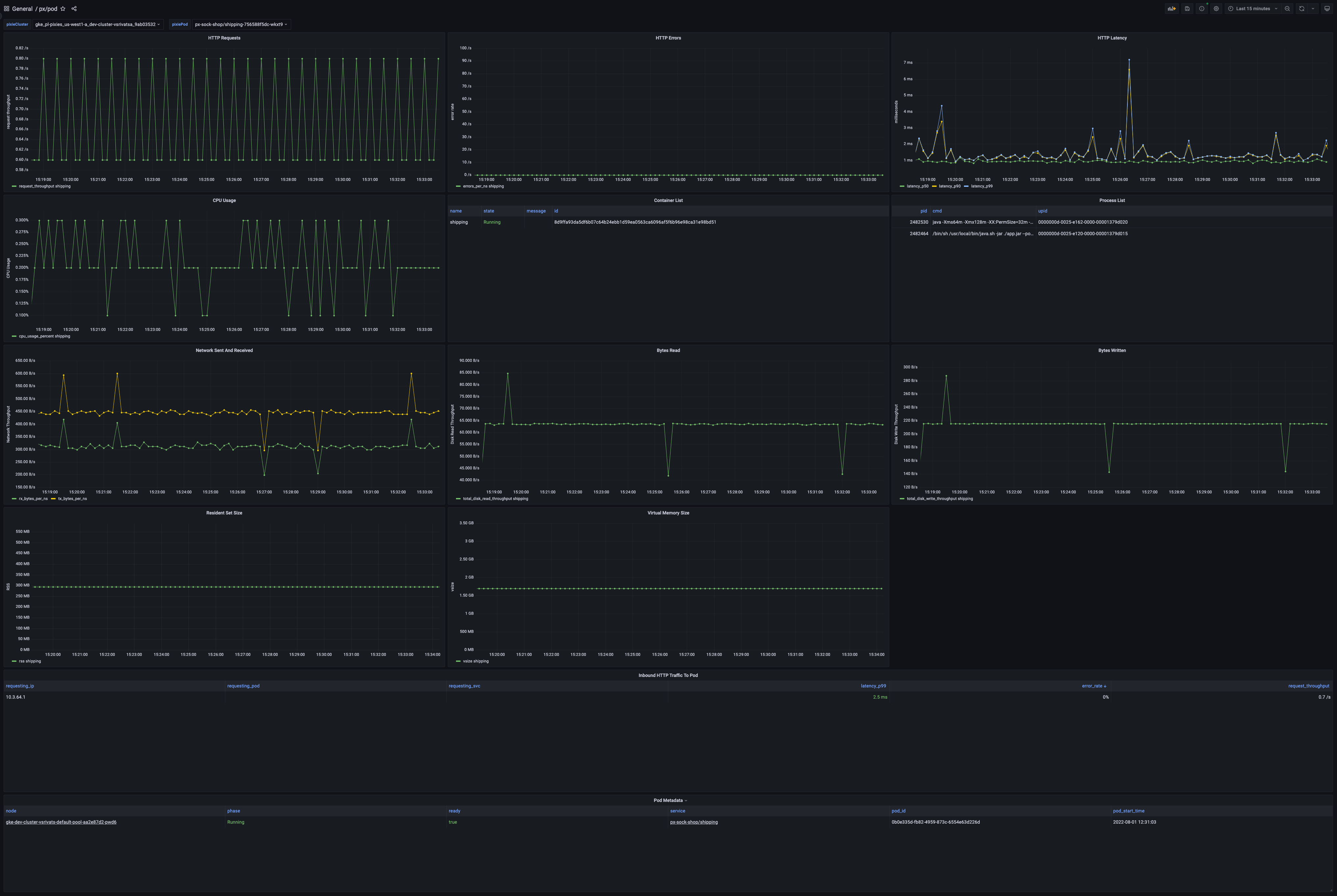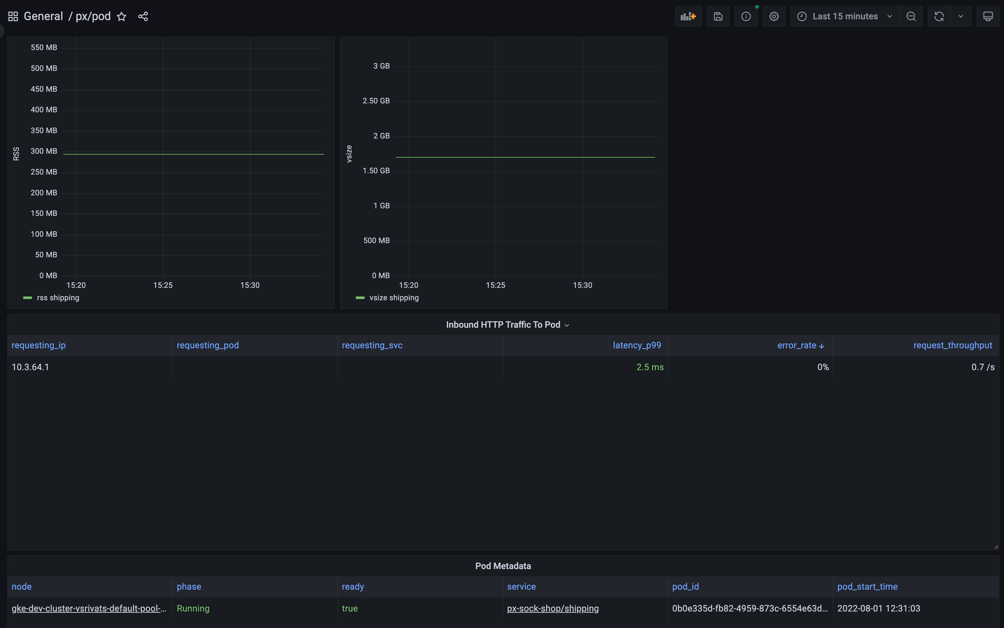 Dashboard shows an overview of the specified pod, including high-level HTTP application metrics, and resource usage.