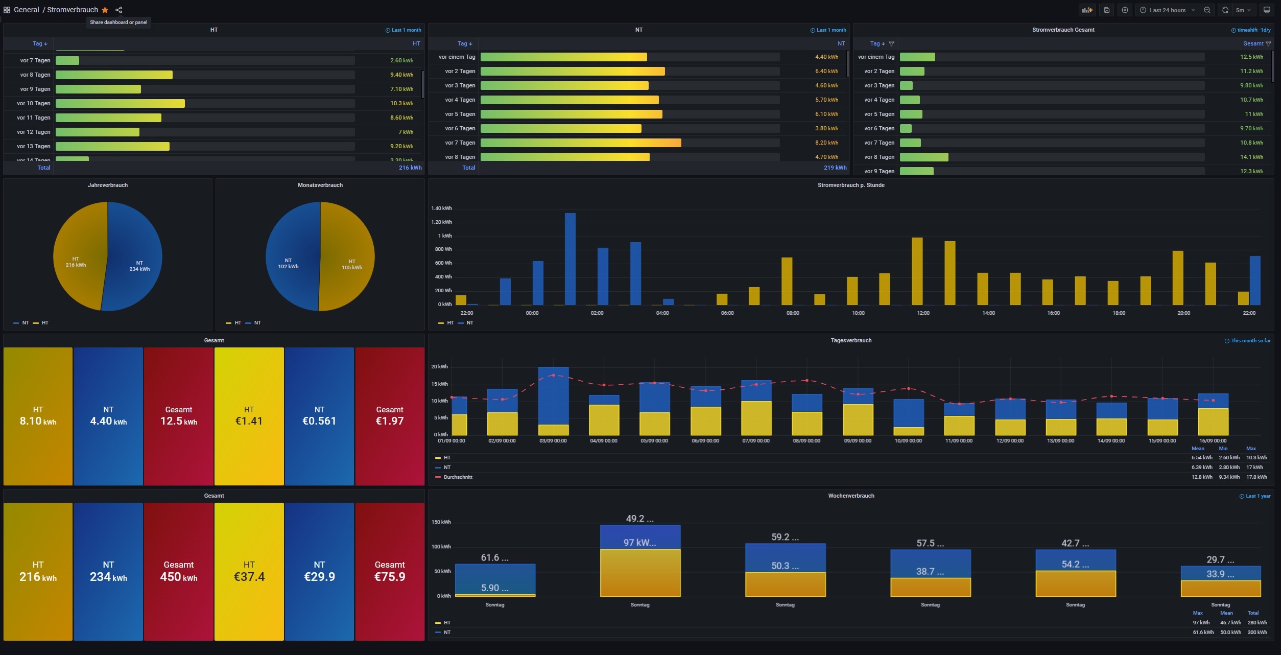 A Dashboard visualizing the HT and NT Values from your electricity meter. Board is getting the data from influxdb1.8. All panels are stored only with the two electricity meter values NT and HT so it's quite easy to adjust.