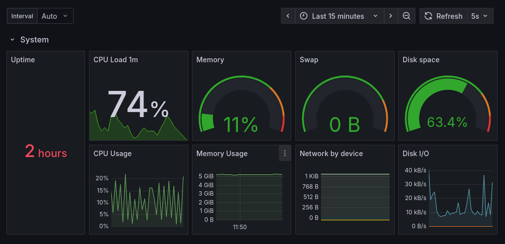 The System Monitoring dashboard uses the prometheus data source to create a Grafana dashboard with the gauge, stat and timeseries panels.