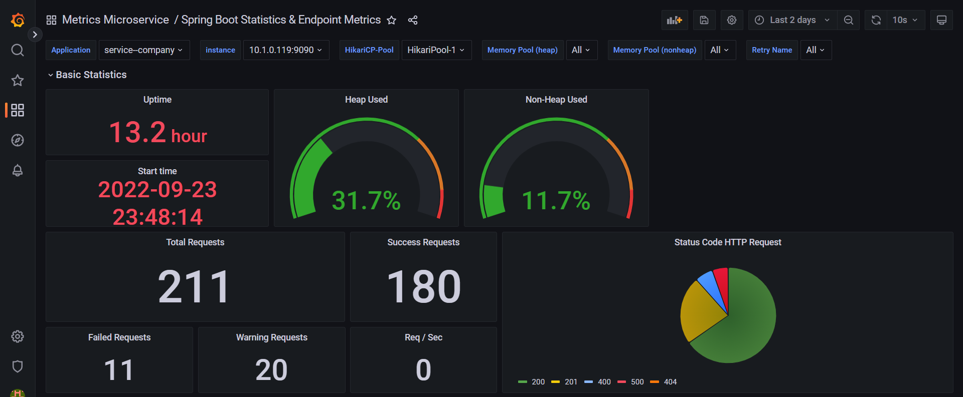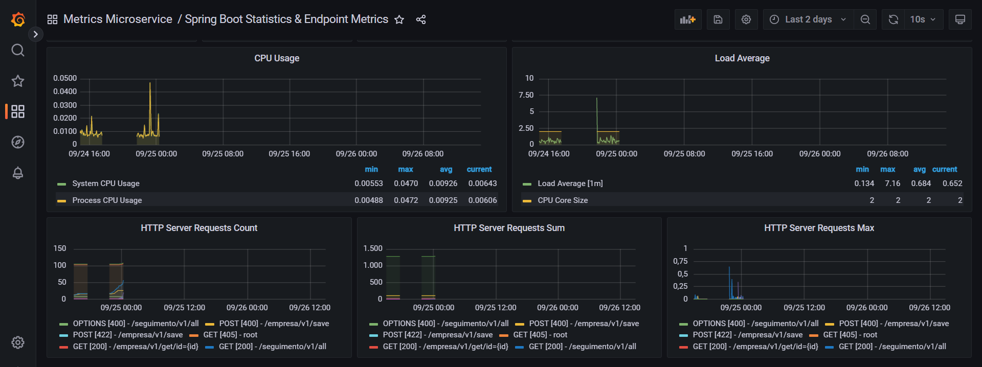 Métricas de Quantidade de request de sucesso, erro, warning, spring data, entity, resilience retry, CPU e memória e outros, esse dash foi corrigido alguns erros que foi publicado na versão anterior.
