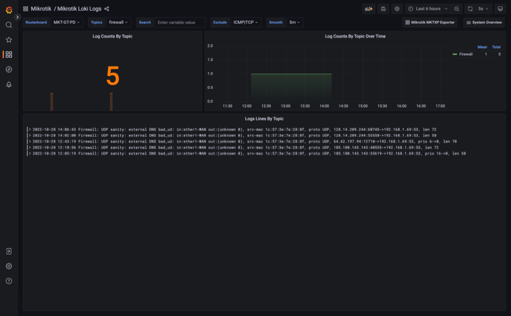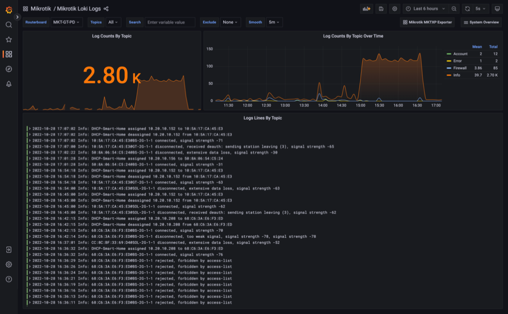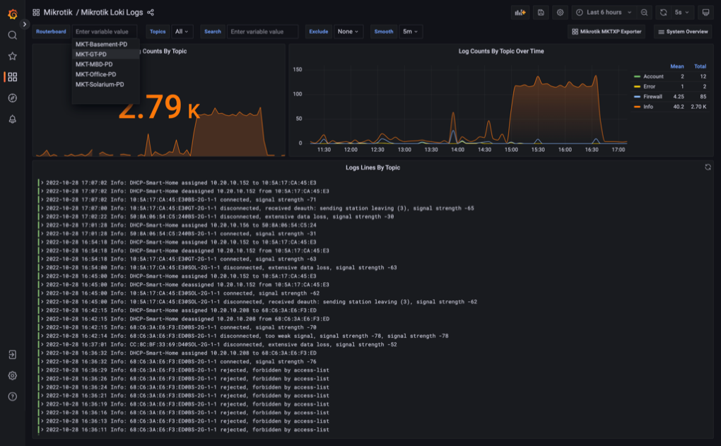 This dashboard is a part of MKTXP-Stack, a dockerized syslog-ng / promtail / Loki stack to receive & process logs from multiple Mikrotik RouterOS devices in a centralized location